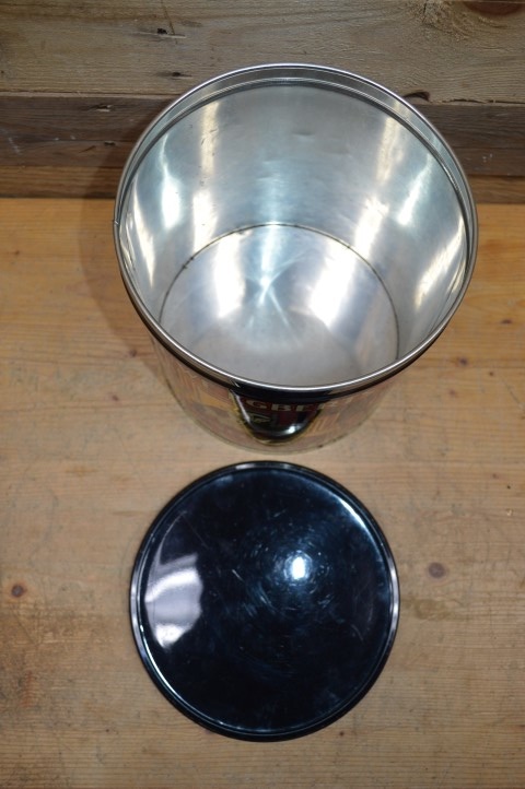 Omdat dit grote metalen DE blik al wat ouder is zijn er wel wat gebruikssporen te bespeuren, maar ondanks dat is deze prachtige vintage decoratie nog steeds een echte blikvanger die overal in huis goed tussen past.