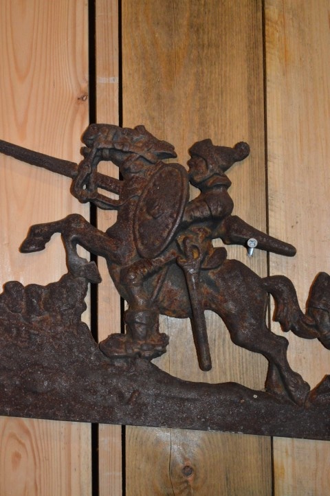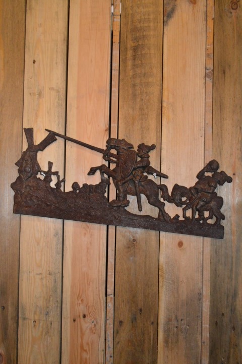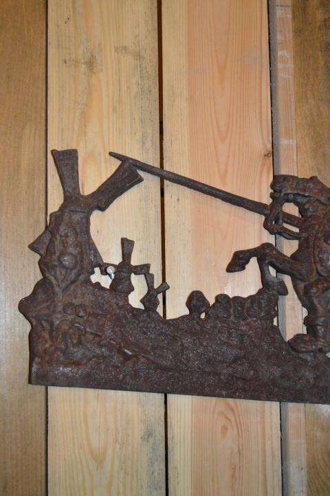 Een zeldzaam wandornament van gietijzer, met als voorstelling de aanval van Don Quichot op de molen naar de roman van de Spaanse schrijver Cervantes.