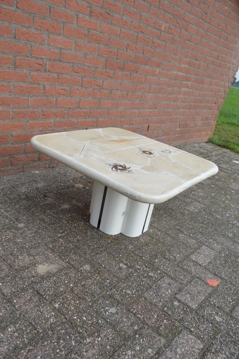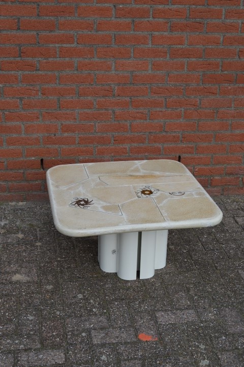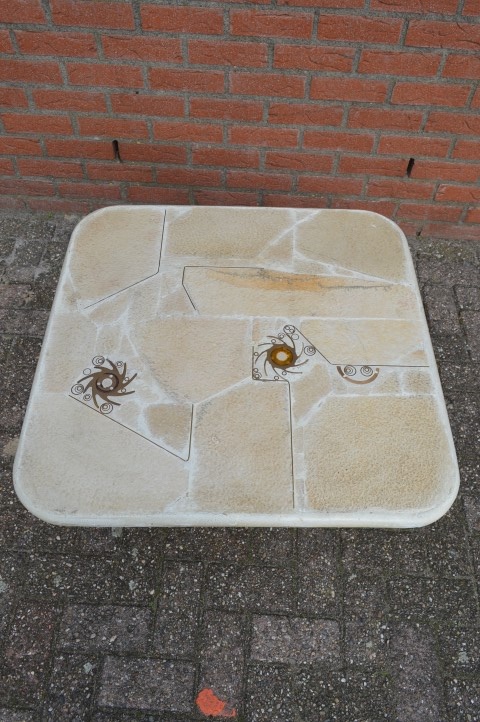 Fantastische Brutalist Kingma design salontafel uit het atelier van Paul en Marcus Kingma. Deze exclusieve design tafel uit de jaren 90 heeft een speelse metalen kolompoot en een ingelegd natuurstenen blad waarin de voor Kingma kenmerkende messing patronen zijn verwerkt. De combinatie van natuursteen, metaal en messing geeft de tafel een krachtige brutalist uitstraling die in veel interieurs een echte blikvanger vormt. De tafel verkeert in redelijke vintage staat met lichte schade aan de rand van het blad.