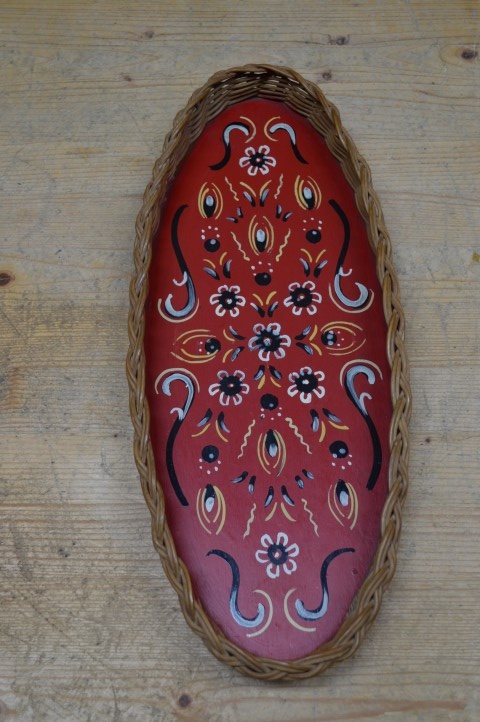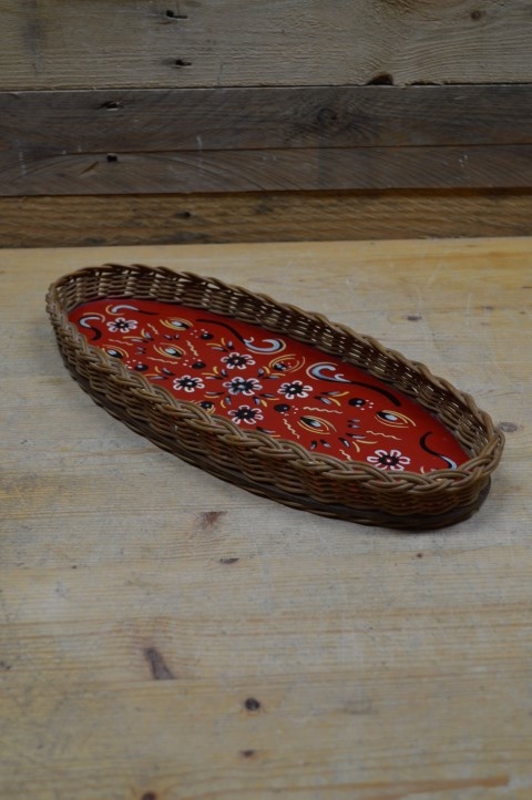 Dit kleine vrolijke wilgentenen dienblad met Hindelopen beschildering is ovaal. Het is ideaal voor het serveren van een of twee kopjes koffie en thee, maar kan ook uitstekend gebruikt worden als broodmandje of decoratie. Een vrolijke noot op de ontbijttafel of bij de lunch.