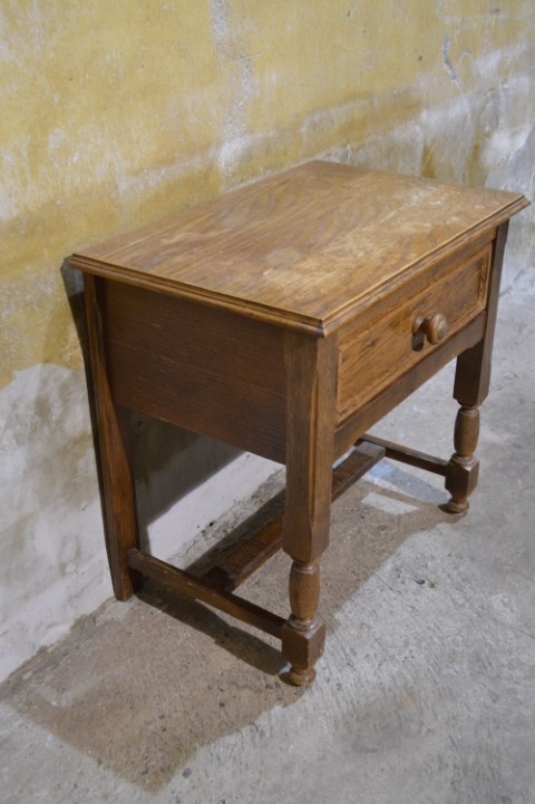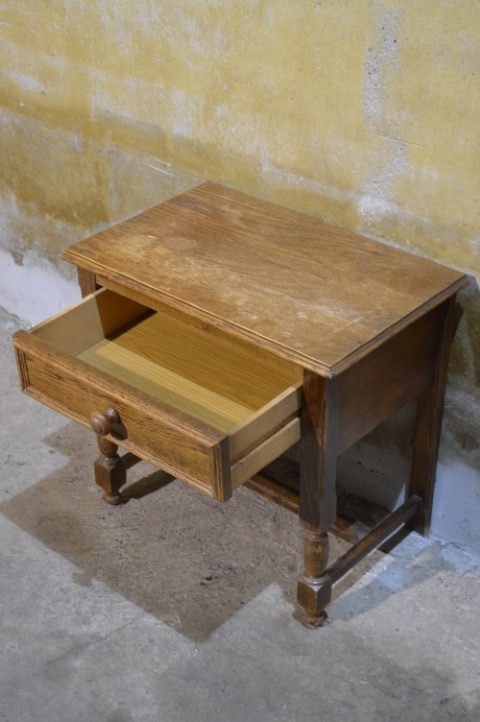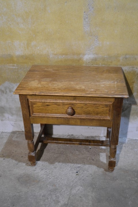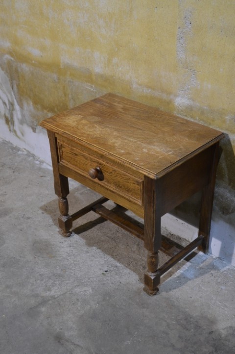Compact en veelzijdig! Eiken kastje met lade donker is een praktisch en sfeervol meubel dat je op verschillende manieren kunt gebruiken. Ideaal als nachtkastje naast het bed of als klein bijzetkastje in de woonkamer. De warme donkere eikenkleur geeft het kastje een karaktervolle uitstraling die past in zowel landelijke als vintage interieurs. Het kastje heeft gebruikssporen en fineerschade op het blad, passend bij de leeftijd.