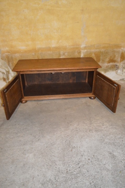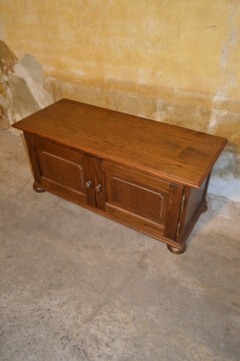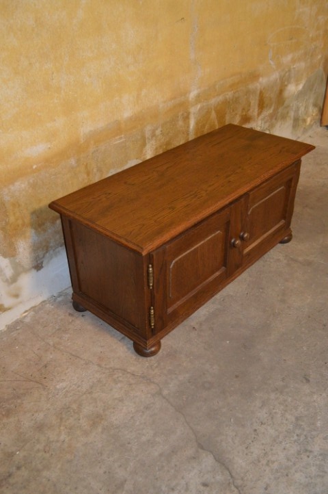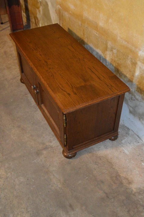 De eiken klepkast is uitgevoerd met twee deurtjes aan de onderzijde en een handige bovenklep, waardoor hij ook als kist te gebruiken is. Perfect voor het opbergen van kinderspeelgoed, vazen of andere losse spullen. Door het intensieve gebruik in het verleden heeft de kast zichtbare gebruikssporen, wat zorgt voor een warme, geleefde uitstraling. Een karaktervol meubel met een veelzijdige functie.
