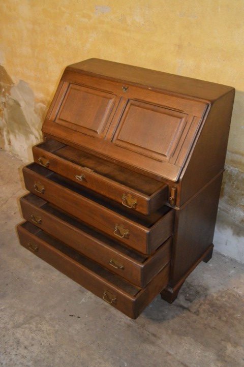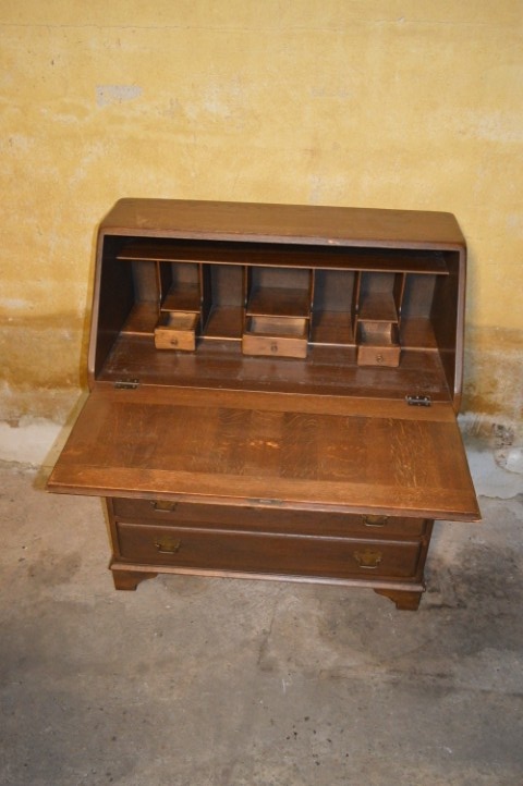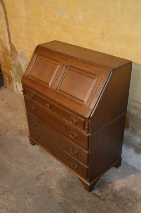 Het bureau is vintage en toont verschillende gebruikssporen, wat bijdraagt aan het karakter van dit meubelstuk. Het slot van de klep is kapot, maar de klep functioneert nog prima. Een stijlvol, praktisch en authentiek bureau dat een warme uitstraling toevoegt aan elk interieur.