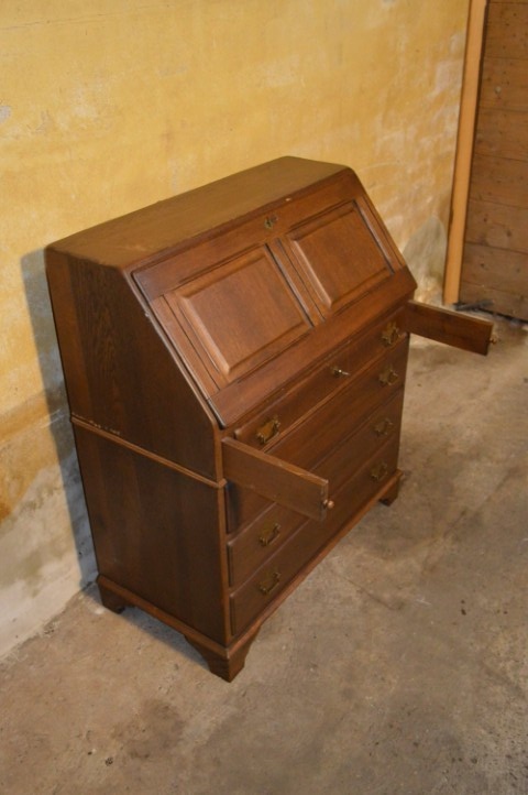 De donker eiken klepsecretaire jaren 70 heeft een bovendeel met klep die openklapt tot een praktisch bureaublad. Achter de klep bevinden zich diverse vakjes en laatjes, perfect om documenten, schrijfwaren of andere kleine spullen netjes op te bergen. In de onderkast zitten vier laden met geelkoperen beslag die het geheel extra charme geven.