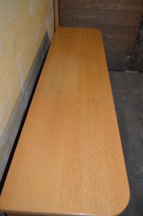 Dit tweedehands dressoir is voorzien van paneeldeurtjes, een ruime lade en drie kastvakken met legplanken, waardoor servies, boeken of apparatuur overzichtelijk opgeborgen kunnen worden. Het middelste vak biedt extra ruimte voor grotere schalen. Achterin is een opening aanwezig voor kabeldoorvoer, wat het meubel ook geschikt maakt als tv- of audiokast. Het vertoont gebruikssporen passend bij de leeftijd, waaronder een vlek op het blad. Een degelijk eiken meubel met karakter – slechts één beschikbaar.