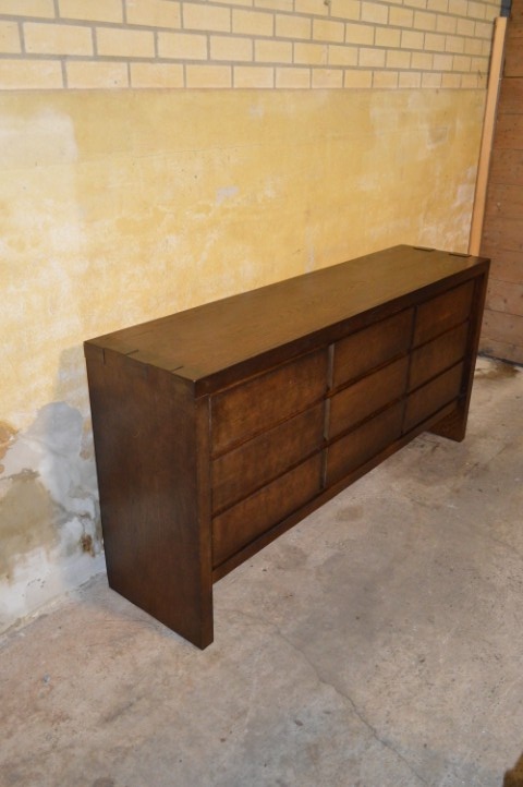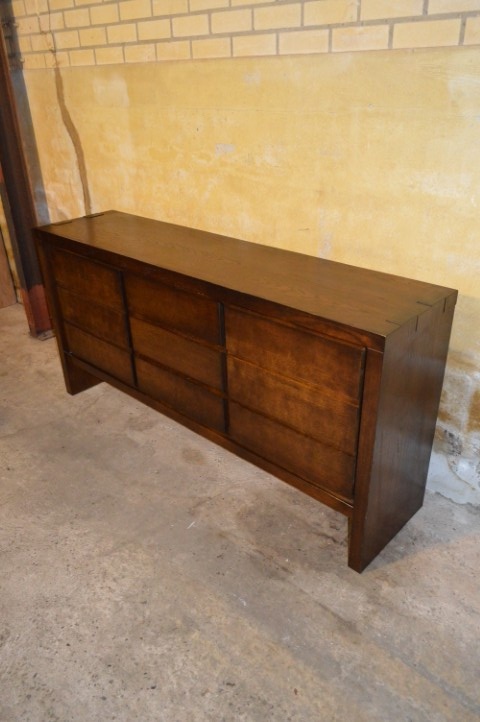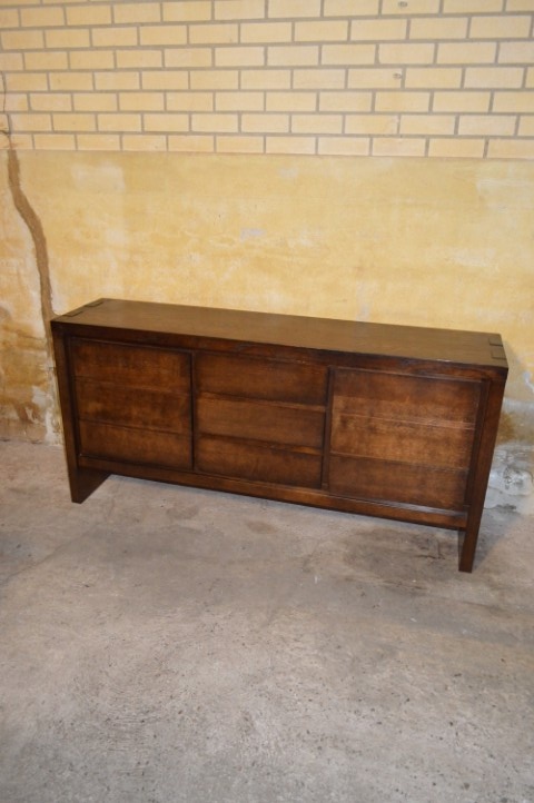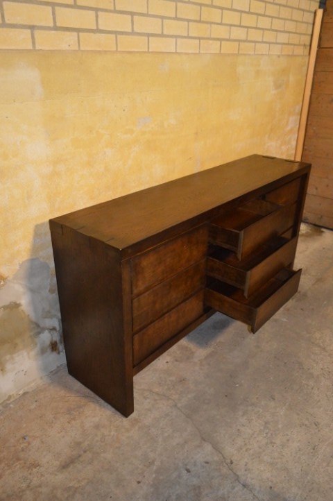 Dit dressoir donker eiken is een prachtig rechtlijnig meubel met twee kastjes en drie laden. De kastdeurtjes zijn vormgegeven alsof er laden achter zitten, wat het geheel een strakker en moderner uiterlijk geeft. Dankzij de praktische indeling beschikt u over veel goed verdeelde opbergruimte – ideaal voor woonkamer, hal of eetkamer.