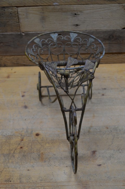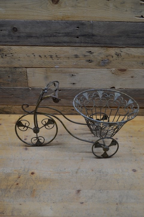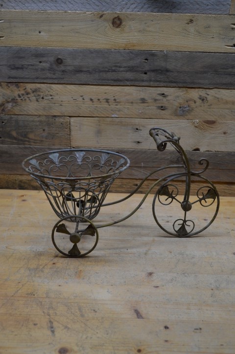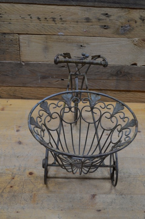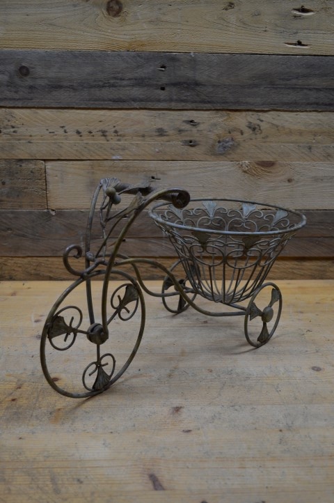 Deze metalen driewieler met mand kan niet fietsen, maar is desondanks ideaal om te gebruiken als decoratie voor binnen en buiten, bijvoorbeeld met een mooi bloempotje in de mand achterop.