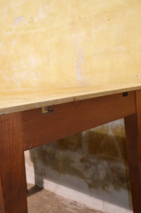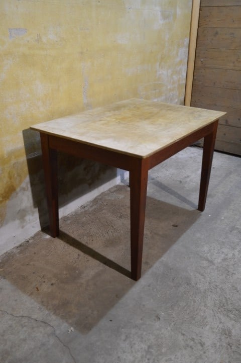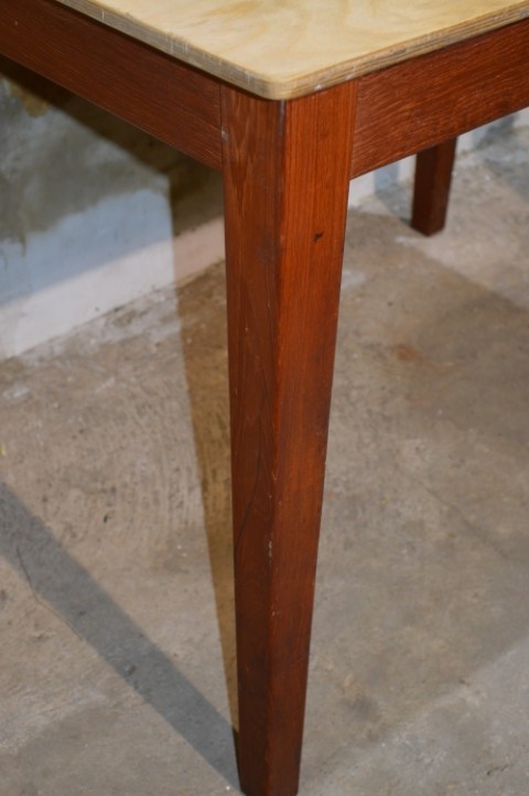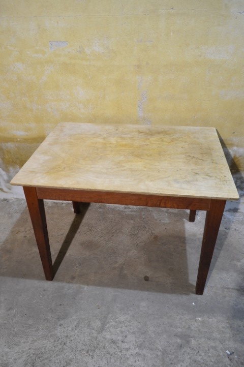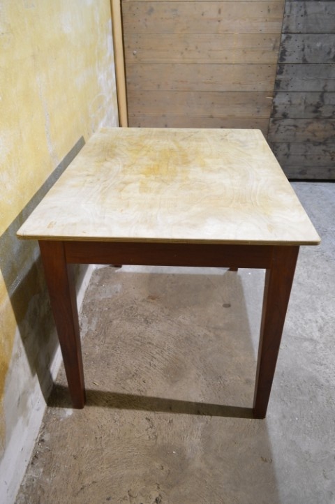De tafel is tweedehands en heeft gebruikssporen. Het blad is van multiplex en de poten zijn vast gemonteerd.
