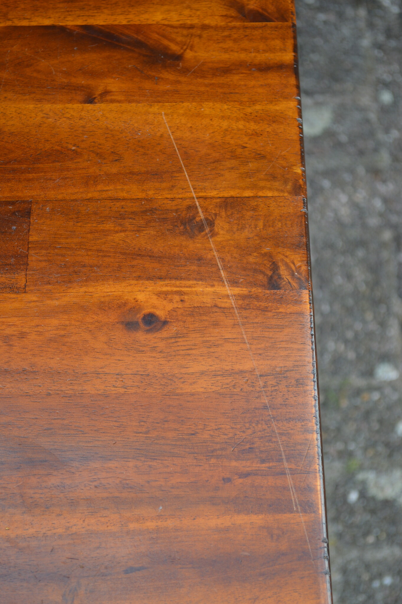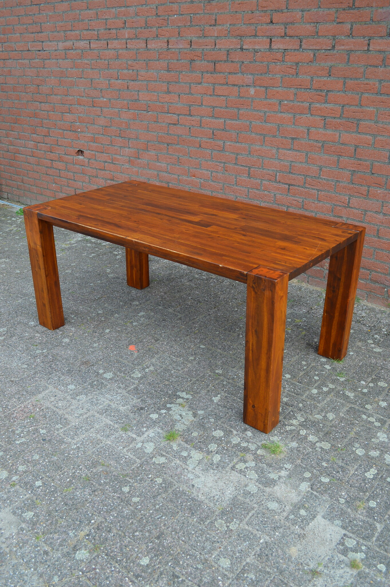 Omdat deze massief houten keukentafel eerder gebruikt is, zijn er wel enige gebruikssporen, zoals enige krassen in het blad, en beschadigingen aan de laklaag maar desondanks verkeert deze gezinstafel nog steeds in goede staat en kan deze nog uitstekend gebruikt worden in een grote keuken of eetkamer.