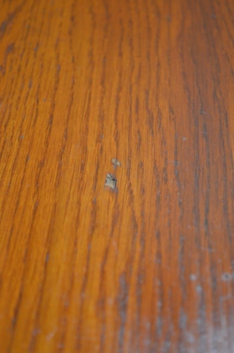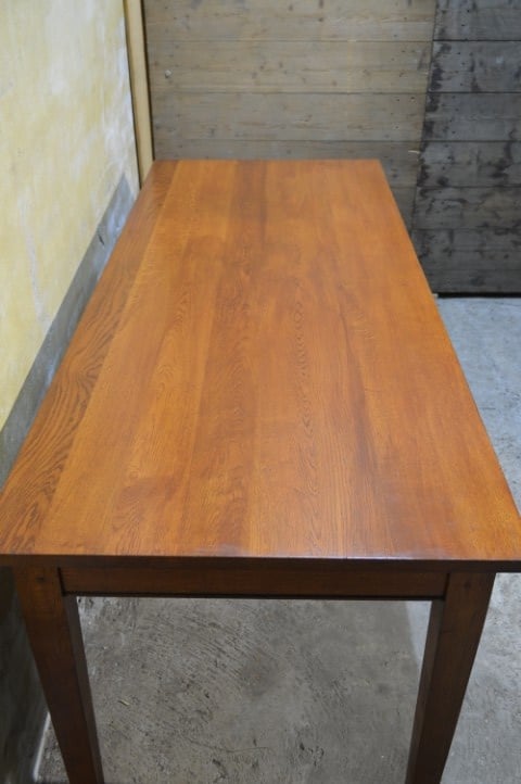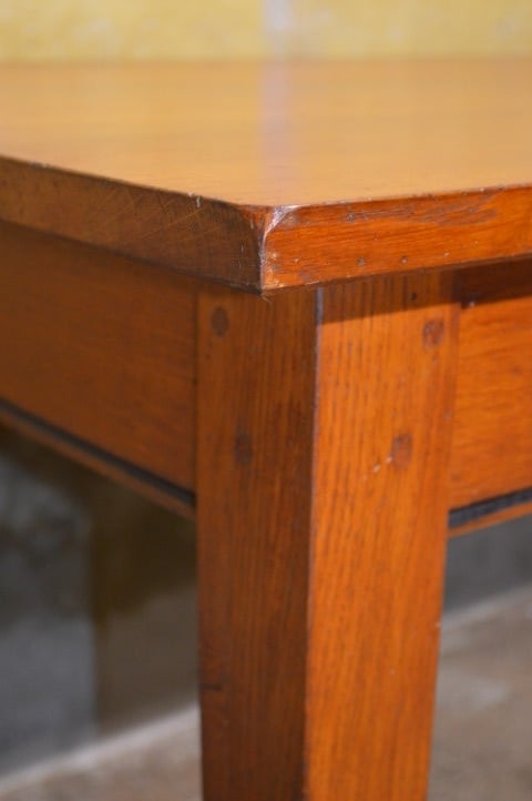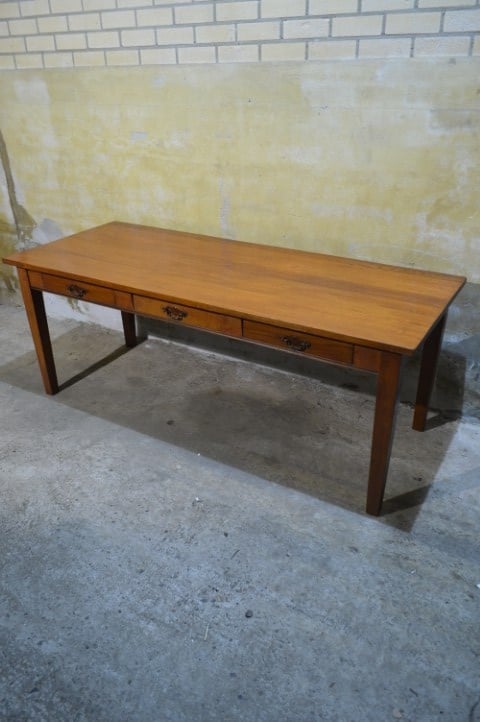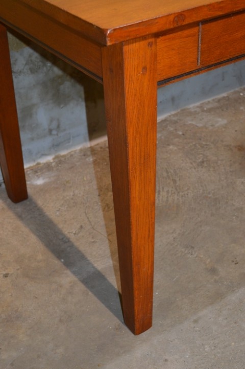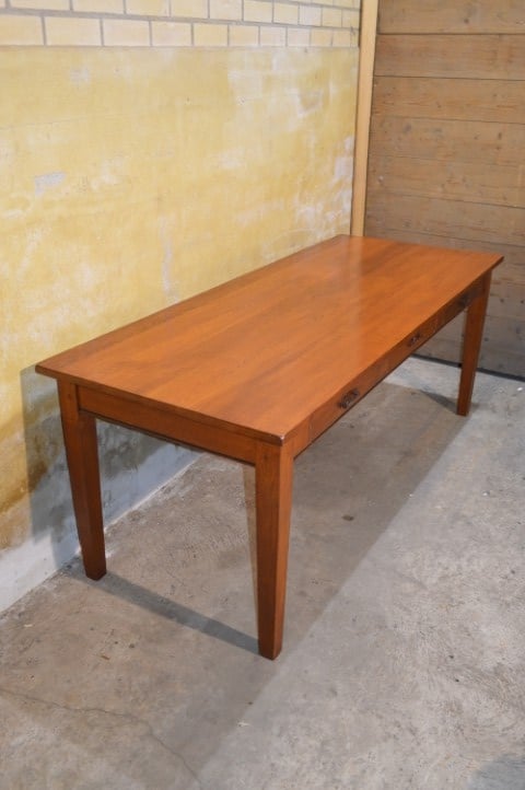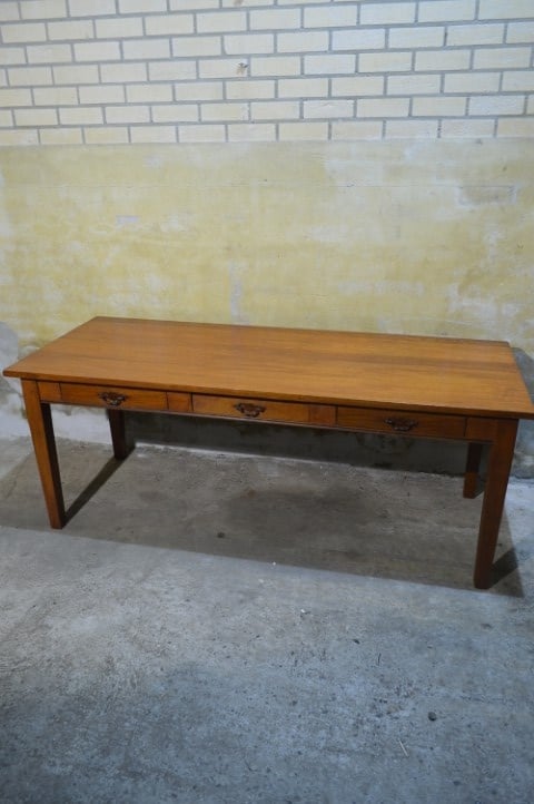 De tafel is tweedehands en heeft gebruikssporen die zorgen voor een mooie, doorleefde uitstraling. De poten zijn vast en niet demonteerbaar.