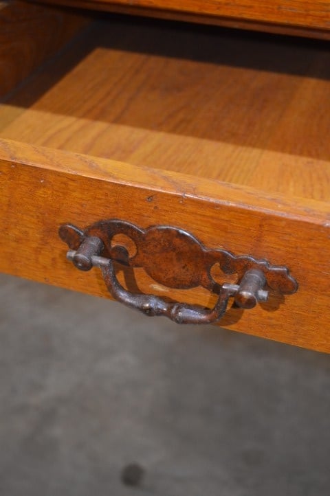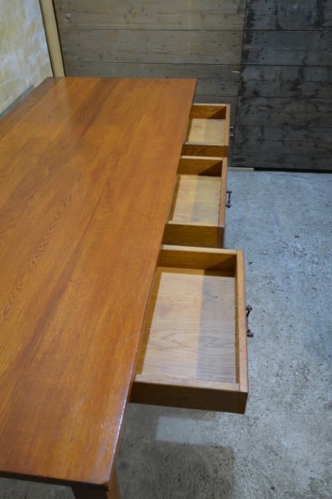 Deze massief eiken eettafel met laden is een ruim en praktisch meubel met een warme uitstraling. De tafel is voorzien van drie laden met metalen handgrepen, wat extra gebruiksgemak biedt.