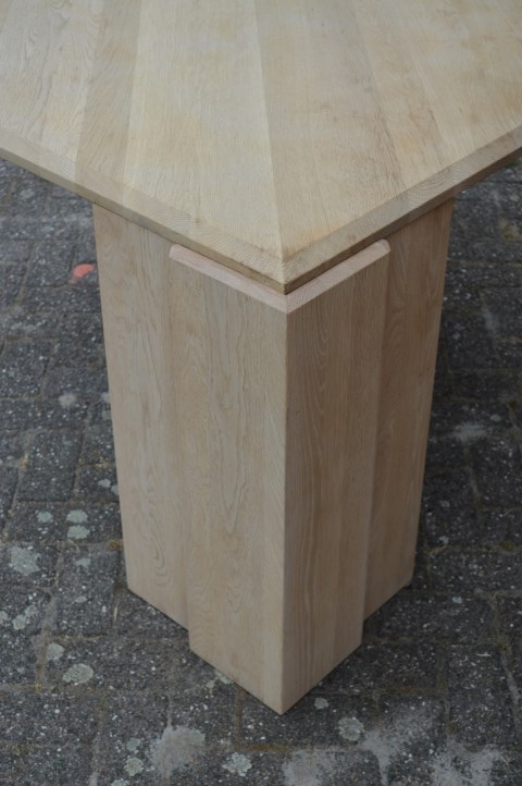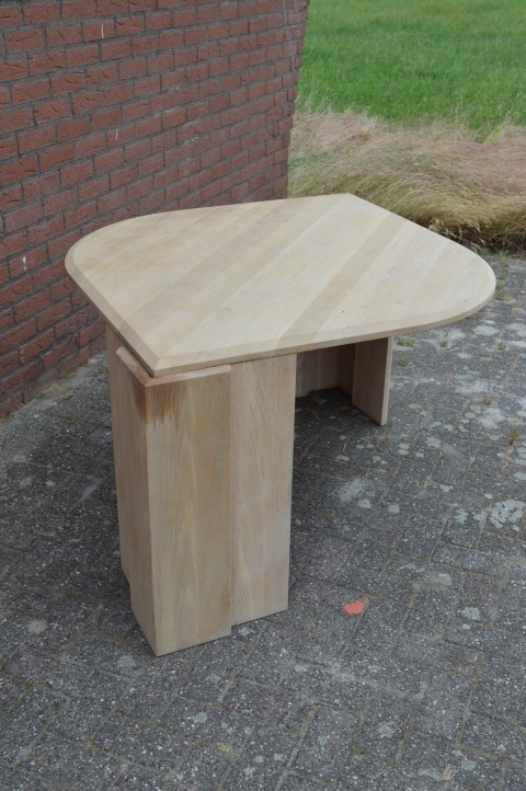 De tafel is volledig gezandstraald waardoor het kale hout door de nieuwe eigenaar helemaal naar eigen inzicht kan worden gebeitst, geverfd, met was of olie ingewreven of in de white wash gezet kan worden. De poten hebben vlekken die behandeld kunnen worden.