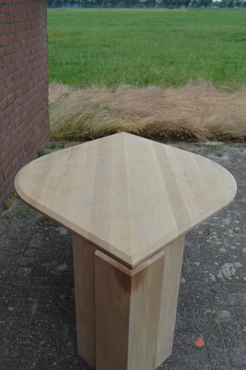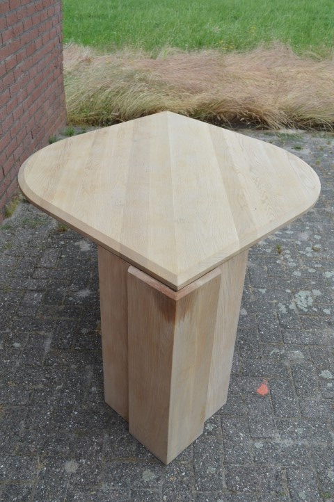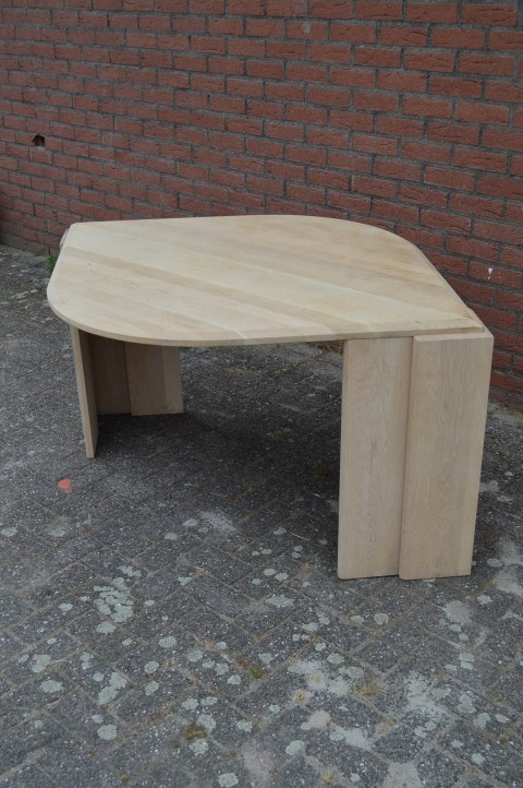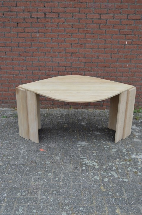 Zeer elegante Italiaanse eettafel uit de jaren 1980 gemaakt van prachtig eikenhout. Het mooie druppelvormige blad is afgerond aan de rand. Het onderstel bestaat uit twee aparte stukken. Deze tafel kan ook zeer goed gebruikt worden als bureau, kantoortafel of vergadertafel.