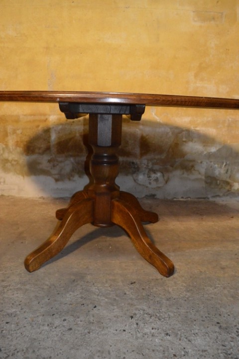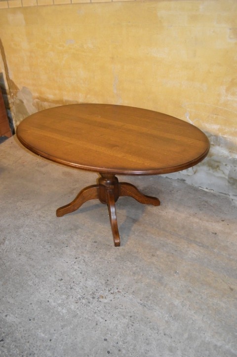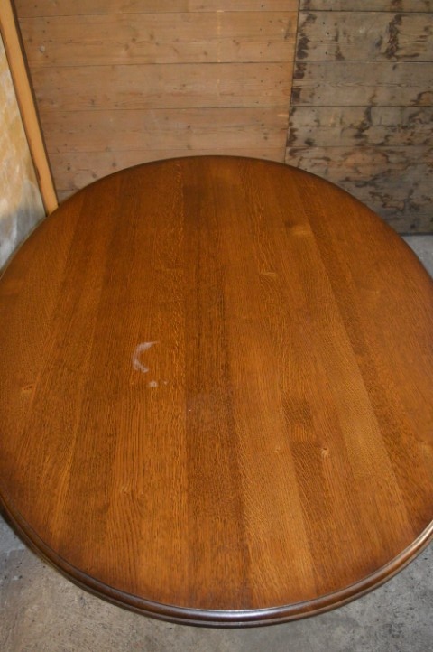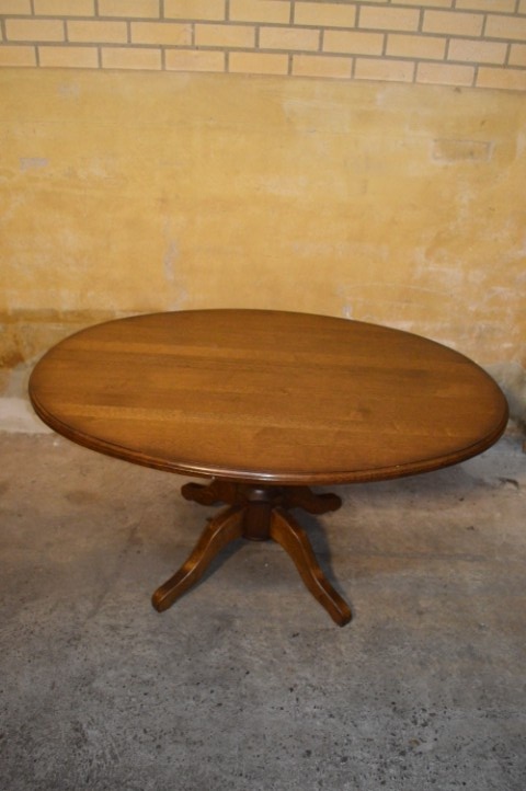 De ovale vorm zorgt voor een uitnodigende en intieme sfeer, ideaal voor lange diners met familie en vrienden. De tafel verkeert in goede staat en heeft gebruikssporen, waaronder een vlek op het blad, passend bij de leeftijd en het karakter van het massieve hout. Door de tafel opnieuw in de olie te zetten, kan de houtkleur nog dieper en rijker worden. Een tijdloos meubelstuk dat direct warmte en uitstraling toevoegt aan de eetkamer.