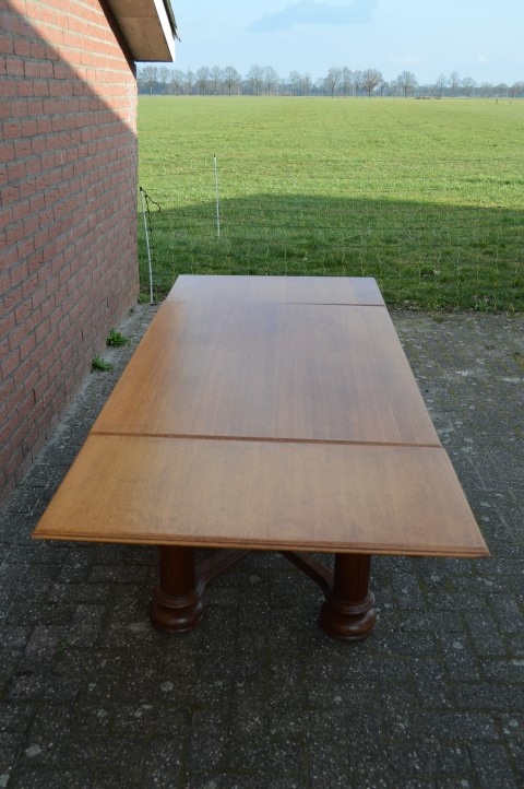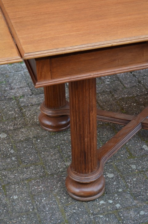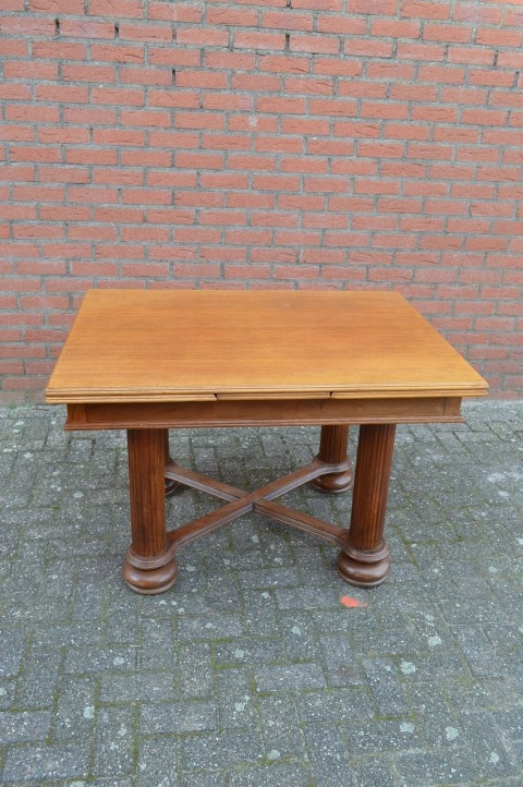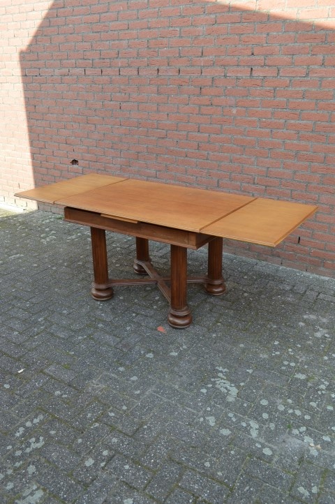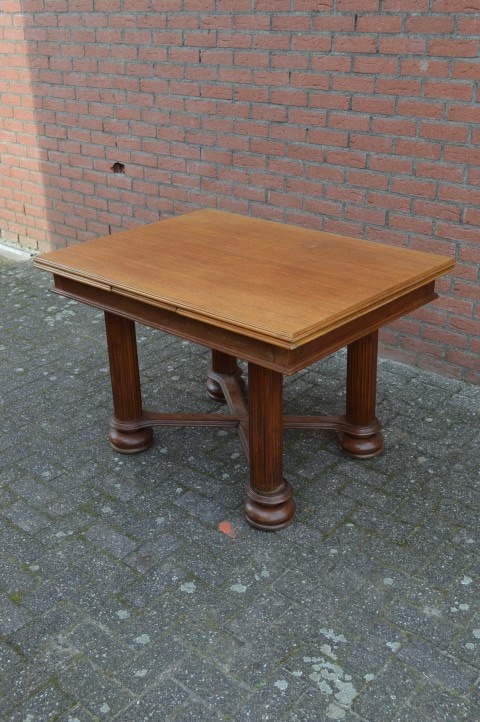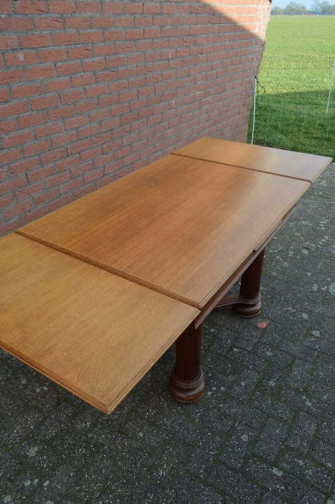 Elegante rechthoekige eettafel van gelakt eiken met uitschuifbaar tafelblad en donker eiken onderstel dat bij uitstek geschikt is voor als u even wat extra ruimte op tafel nodig hebt. Deze tafel heeft vaste poten en heeft als het tafelblad volledig uitgeschoven is een lengte van 209 cm en is daarmee ideaal voor als er regelmatig mensen een hapje mee komen eten maar er niet altijd een grote tafel nodig is. De tafel is wel gebruikt en heeft daarom natuurlijk gebruikssporen, maar is verder nog in goede staat en kan dus als het goed is nog jaren mee.