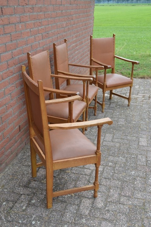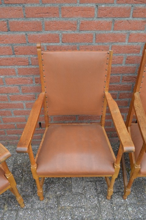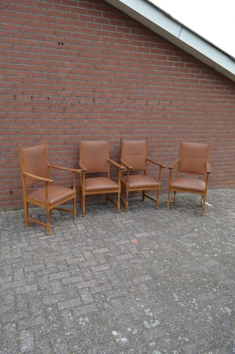 Deze set van 4 massief eiken stoelen met armleuningen en bruin leren bekleding is gemaakt om comfortabel te zitten en ontspannen te genieten van een goed gesprek.