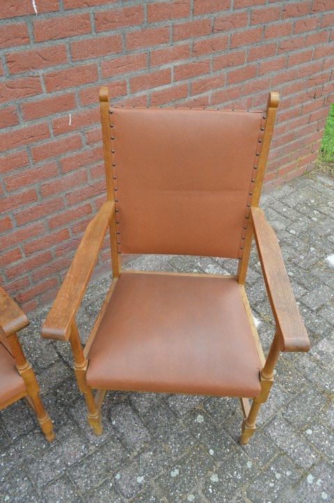 De stoelen staan prachtig aan een eettafel, maar kunnen ook los in een zitkamer worden geplaatst. Ze ademen sfeer en karakter — wij zien er zo onze opa’s in zitten, gezellig keuvelend. De stoelen hebben gebruikssporen passend bij de leeftijd. Van één stoel ontbreekt een klein stukje aan de bovenkant.