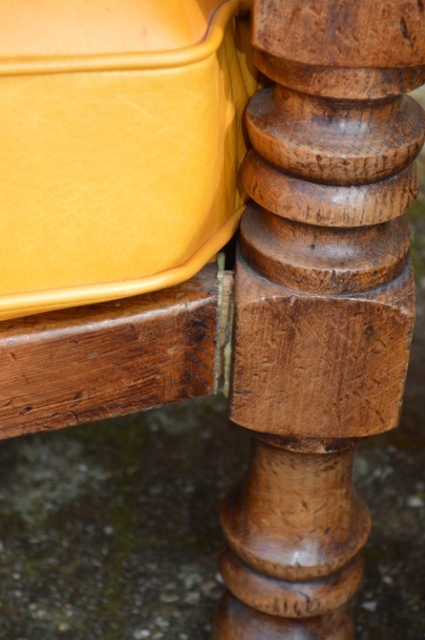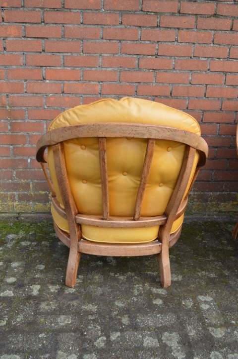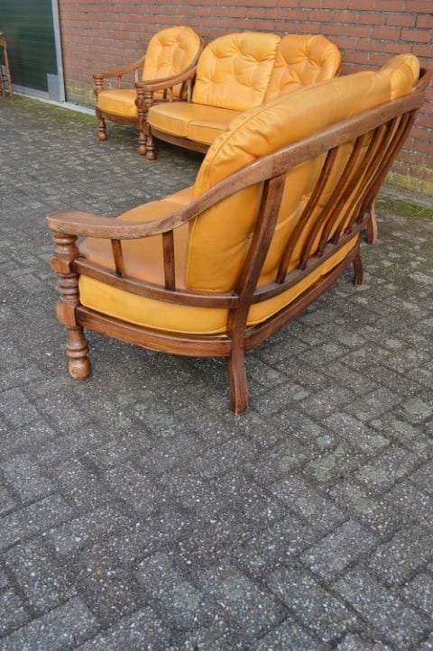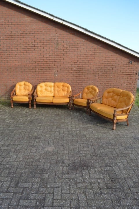 Dit eiken bankstel met leren kussens bestaat uit twee tweezitsbanken en twee fauteuils en vormt samen een mooie complete zithoek. Het stevige eiken frame geeft de set een warme en robuuste uitstraling. De kussens zijn bekleed met prachtig goudgeel leer dat door de jaren heen een natuurlijke verkleuring heeft gekregen. Omdat de banken lange tijd in een lichte kamer hebben gestaan, heeft het leer een levendig en authentiek karakter gekregen. Voor veel liefhebbers maakt dat het meubel juist nog mooier en echter.