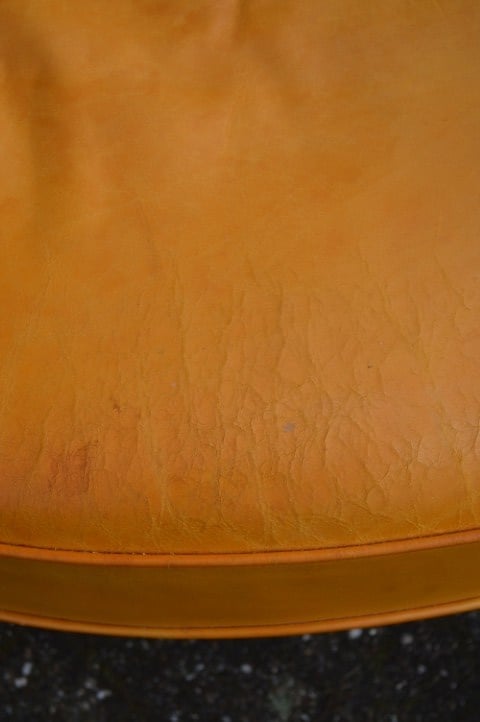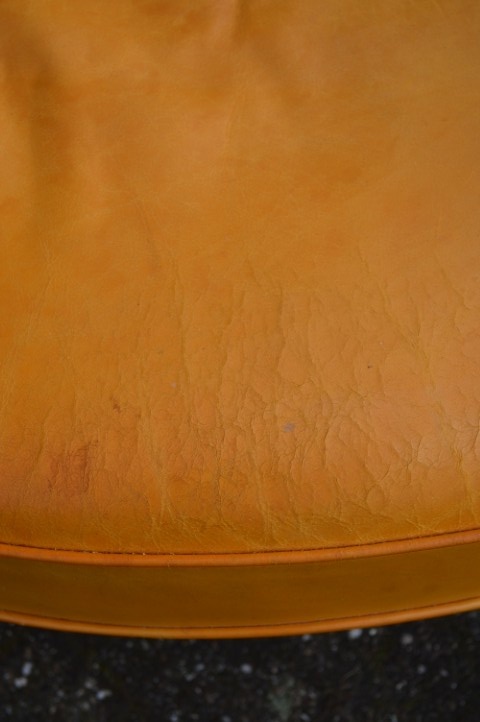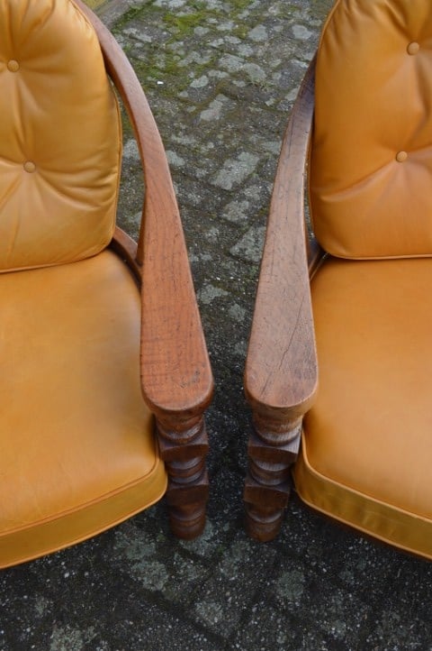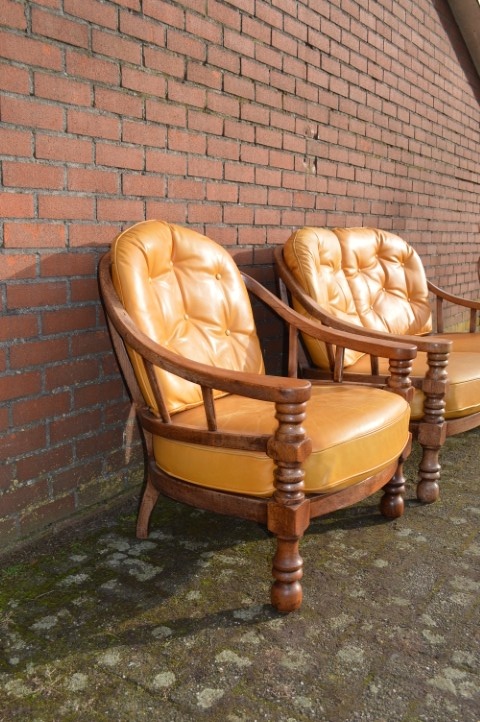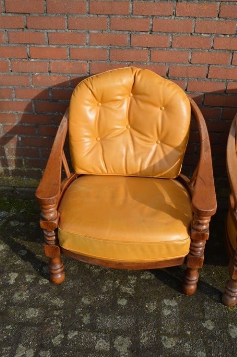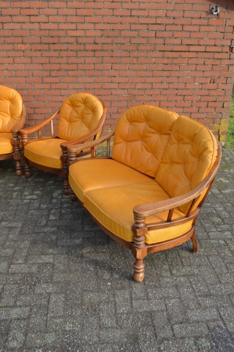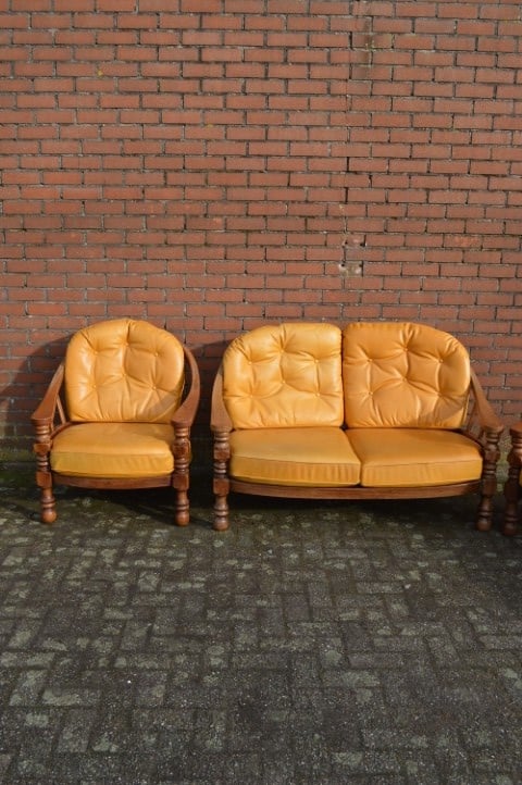 Een opvallende vintage zithoek die zowel in een klassiek als eclectisch interieur goed tot zijn recht komt. Gebruikssporen, leer heeft verkleuring en enkele verbindingen verdienen aandacht.
