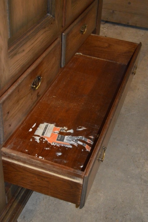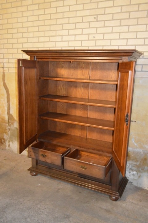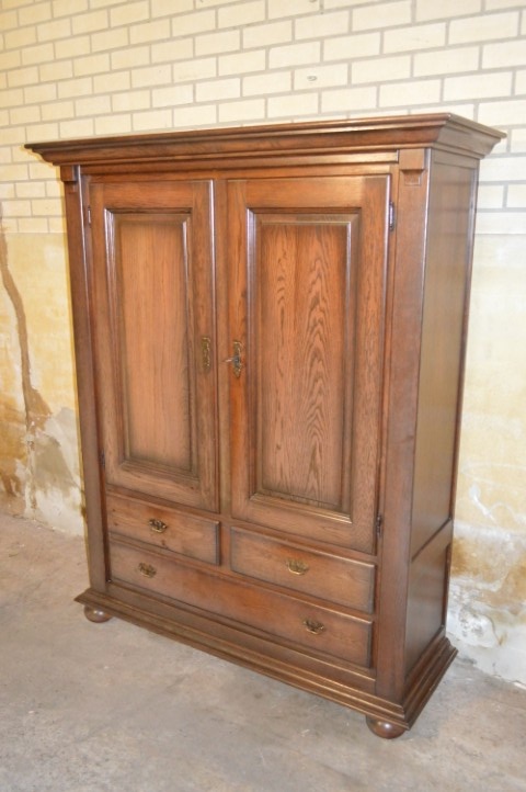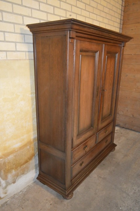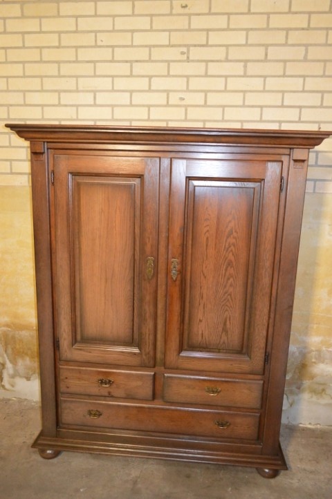 Door de jaren heen heeft het hout een mooie, diepere kleur ontwikkeld, wat bijdraagt aan de warme en doorleefde uitstraling. De kast verkeert in gebruikte staat met gebruikssporen passend bij leeftijd en gebruik. De grote lade klemt en op de bodem van deze lade zit een vlek. Een karaktervolle eiken kast voor liefhebbers van brocante en landelijke interieurs.