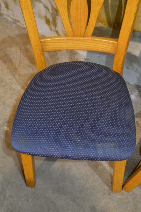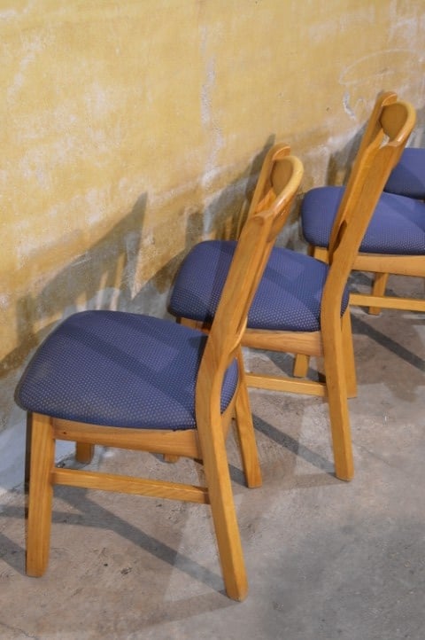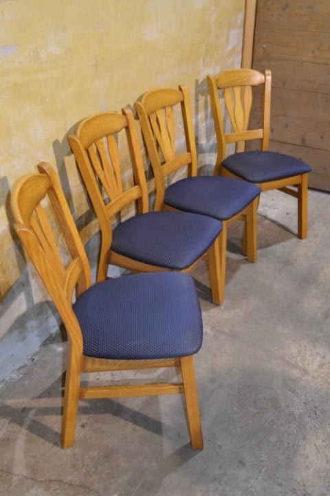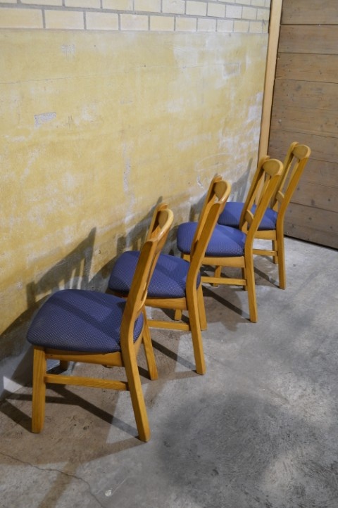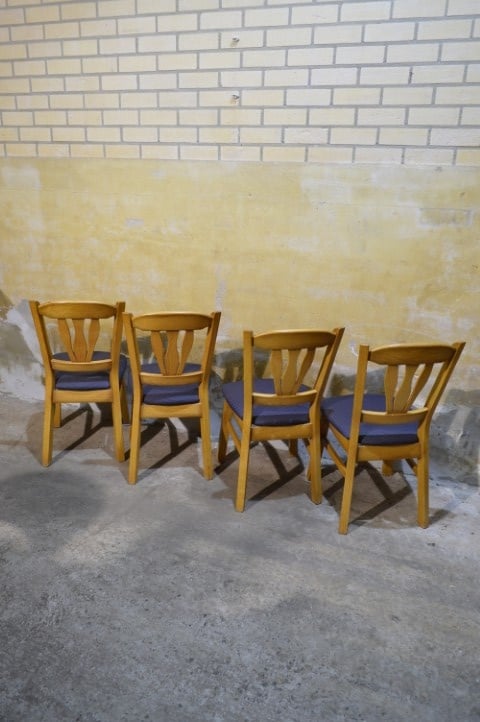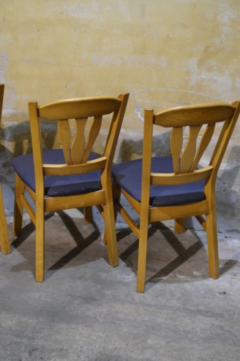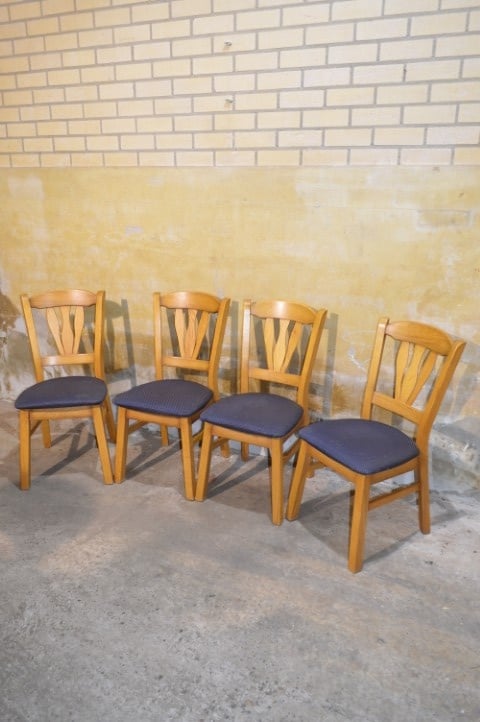 Een echte jaren 70 familietafel-klassieker. Deze set van 4 eiken keukenstoelen met donkerblauwe stoffen zitting straalt warmte en degelijkheid uit. Stevige frames en een tijdloos model dat in vrijwel ieder interieur past. De stoelen vertonen gebruikssporen en vlekjes in de bekleding passend bij jarenlang gebruik in een gezin — eerlijk geleefd, vol karakter.