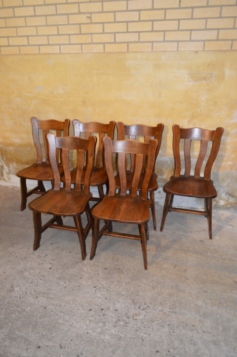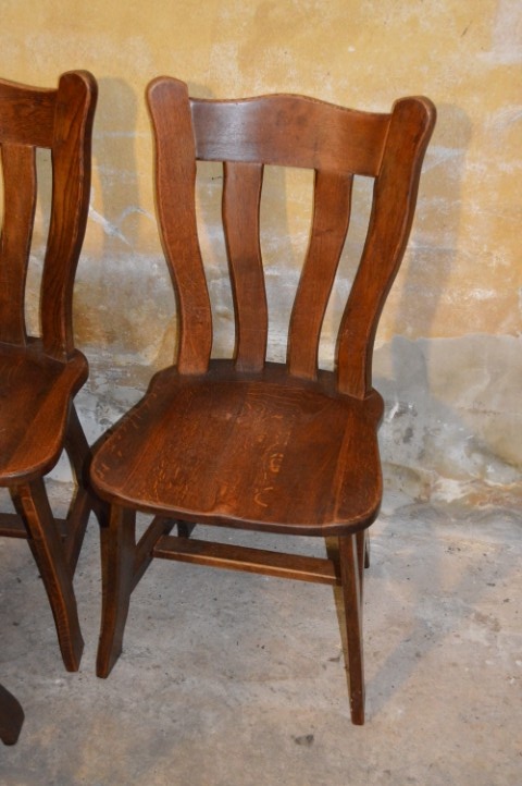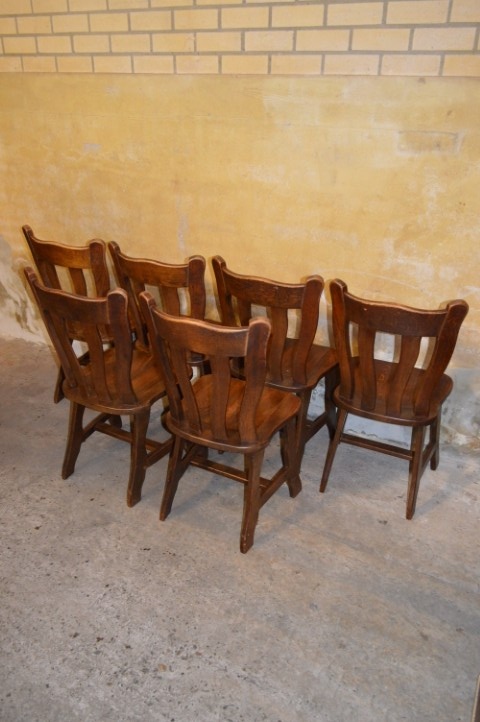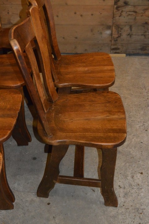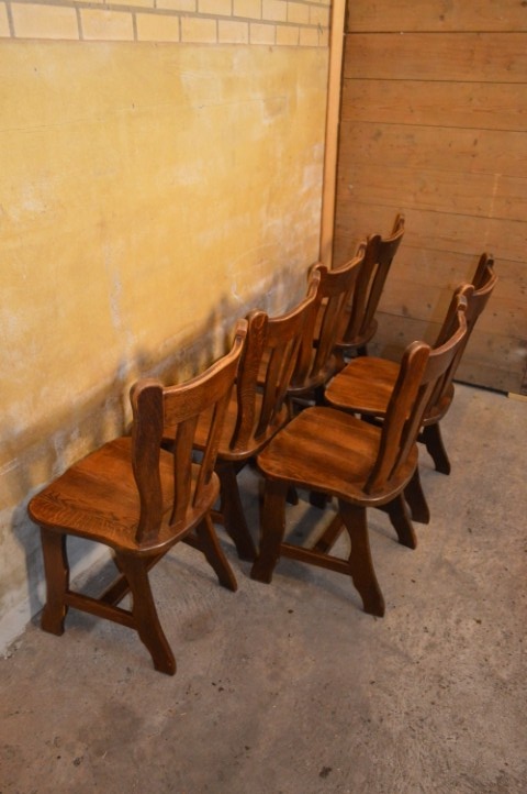 Het speciale model is geïnspireerd op klassieke Elzasser bistrostoelen en kenmerkt zich door robuuste vormen en een solide uitstraling. De stoelen zijn gemaakt van massief eikenhout en stralen vakmanschap en karakter uit. De set verkeert in gebruikte staat met zichtbare gebruikssporen, passend bij de leeftijd en het gebruik. Een bijzondere set voor liefhebbers van authentiek Frans design.