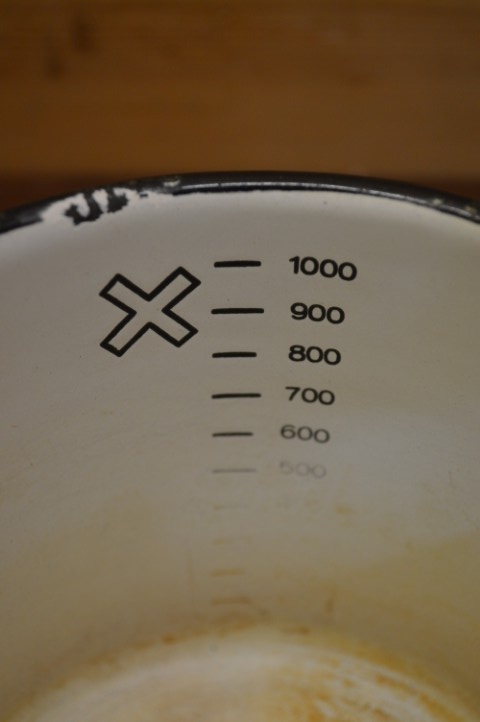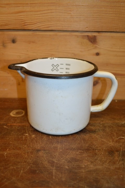 Een prachtige vintage wit/blauw geëmailleerde maatkannetje/ melkkannetje, welke uiteraard ook zeer decoratief is met bijvoorbeeld uw pollepels of bloemen erin.