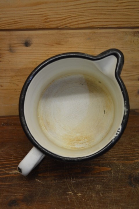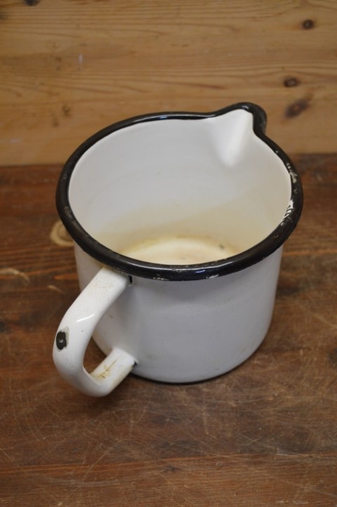 Oud wit geëmailleerd kannetje met handvat – Mid century keuken- of plantenaccessoire