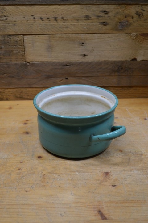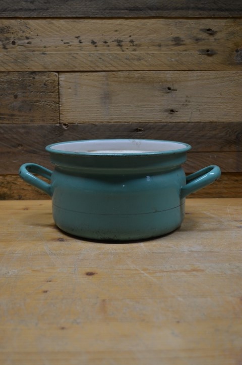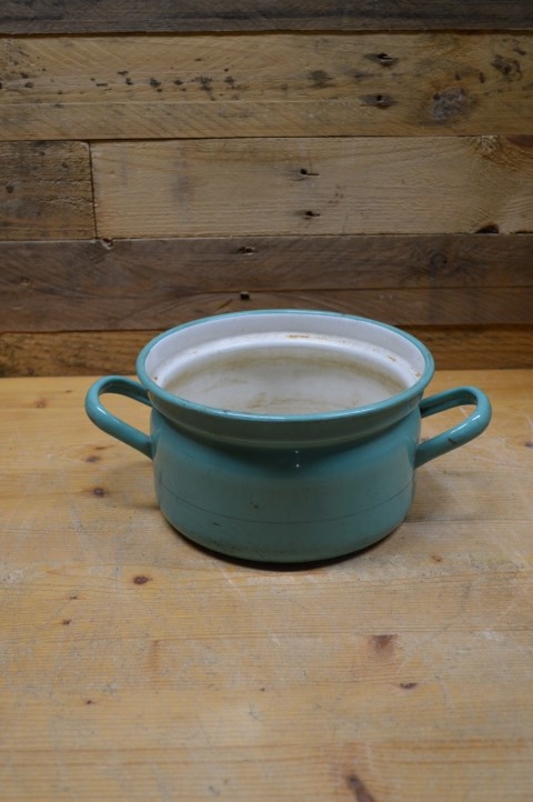 Kleine ouderwetse lichtgroene met een gouden randje geëmailleerde pan voor het koken van bijvoorbeeld groente en aardappelen. Een leuk retro mid century pannetje dat in de jaren 50 uiterst modern was.