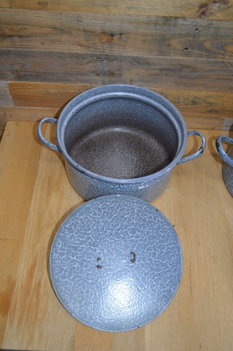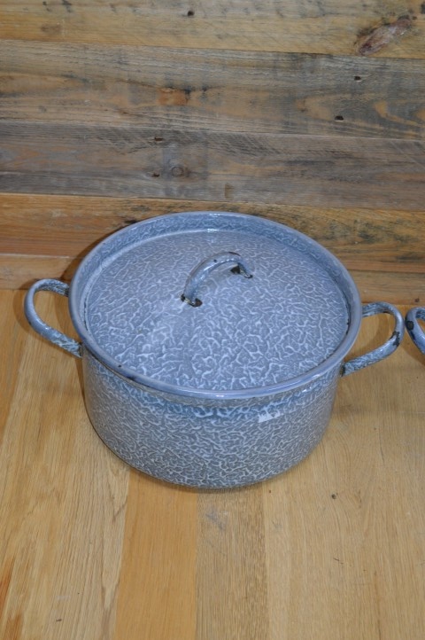 Set van 2 prachtige grijsblauw gewolkte emaille pannen met deksel. Tot voor kort gebruikt om in te koken, en dat zou nog steeds prima kunnen, maar nu ook erg leuk om als bloembak of decoratie te gebruiken, dankzij de mooie lichtblauwe patronen die deze emaille pannen tot een echte eyecatcher maken.