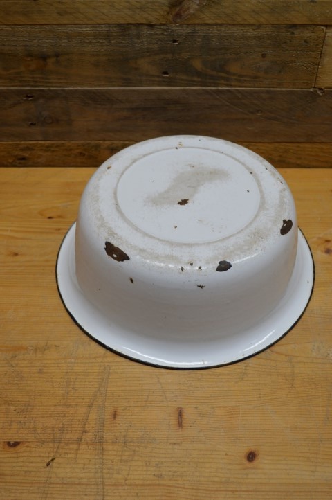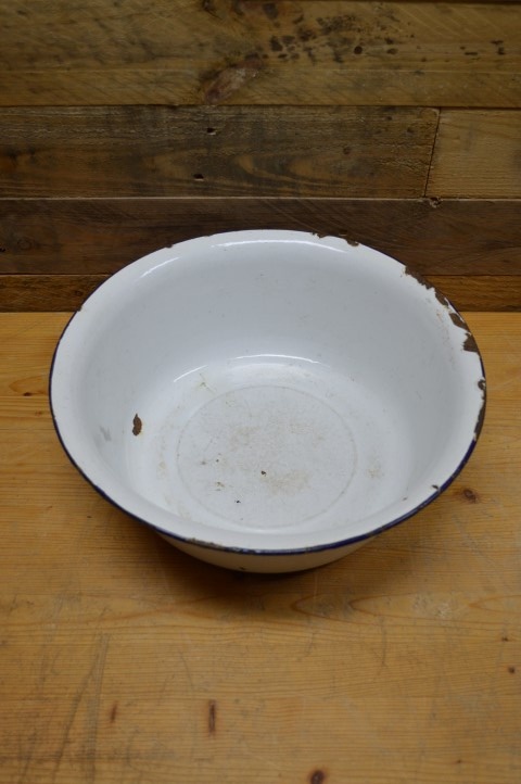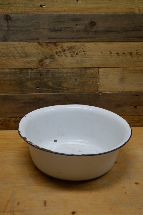 Leuke, wat gehavende, witte emaille schaaltje met een blauw randje. Kenmerkend voor de jaren 40 en 50 is dat het geëmailleerd is zodat het goed schoon te houden was.