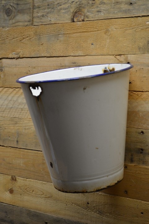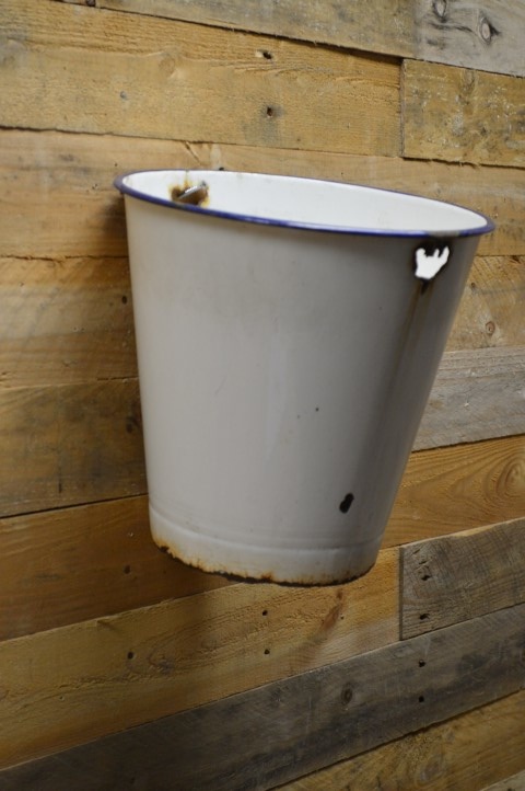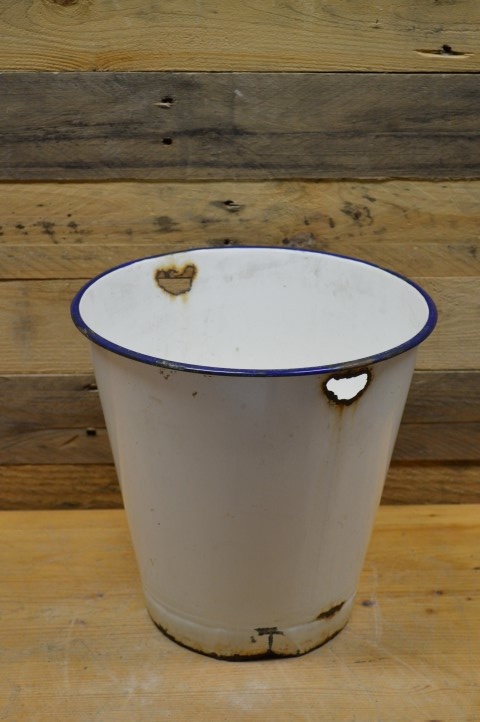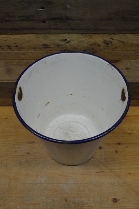 Wit geëmailleerde emmer met een blauwe bies maar zonder handvat. Deze brocante witte metalen emmer stamt uit de jaren 50. Dit soort van metalen emmers werden veel gebruikt in bijvoorbeeld de kinderkamer, het ziekenhuis en bij de dokter. De emmer is wit geëmailleerd vanwege de hygiëne. Het witte emaille is zeer goed schoon te houden en men kon in één oogopslag zien of hij schoon was.