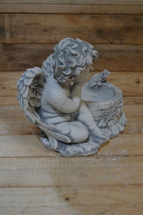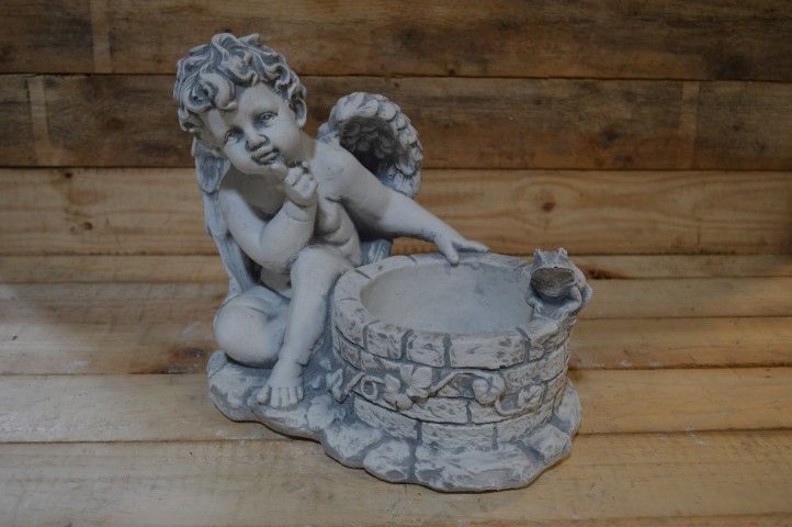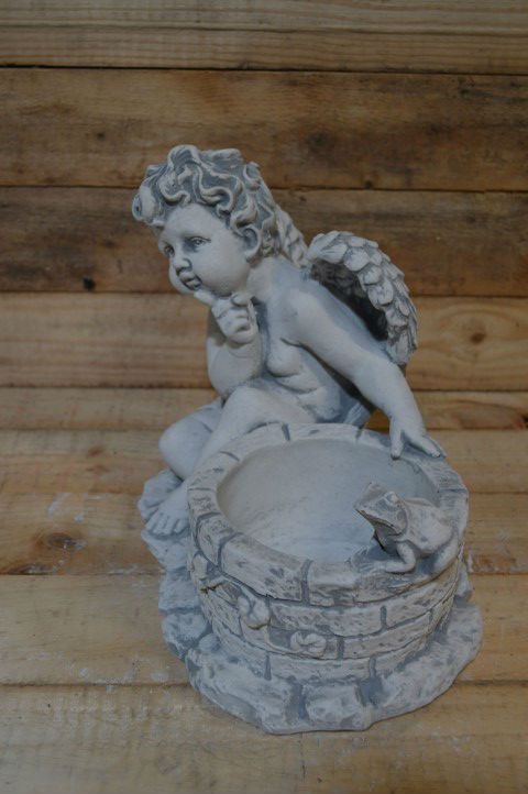 Betonnen beeld van een engel met kikker op een plantenbakje, geschikt voor binnen en buiten