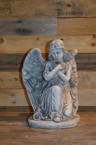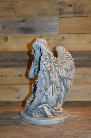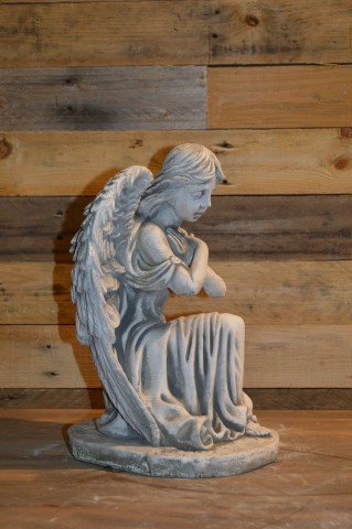 Deze betonnen knielende engel in gedachten is ontroerend en sfeervol. Gedetailleerd tuin- of binnenbeeld dat gevoel, vertrouwen en geloof uitstraalt.