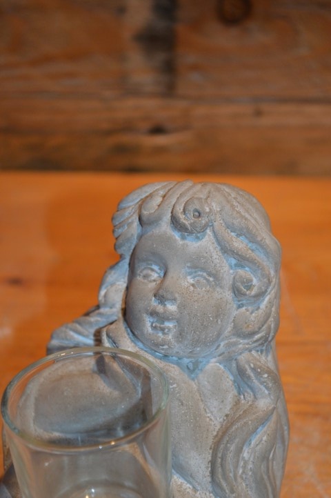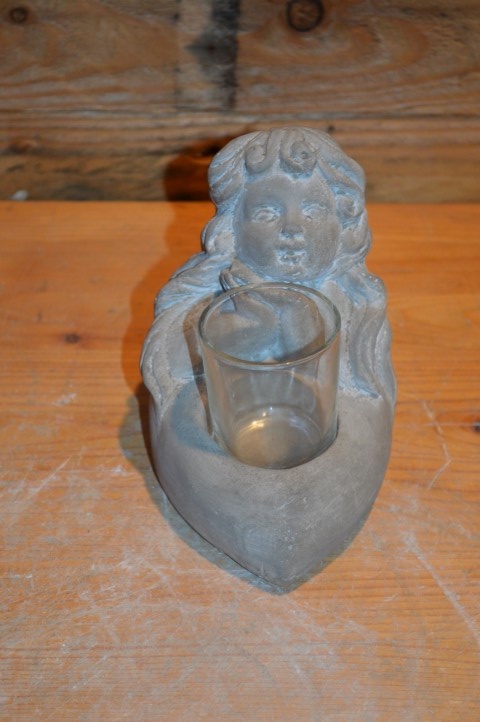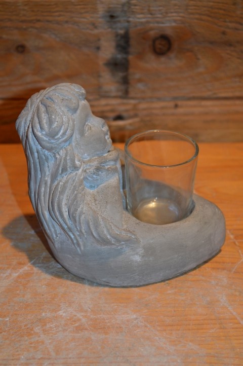 Dit lieve tweedehands betonnen beeldje van een meisje met waxinelichtje is een charmant decoratief element voor elk plekje in huis of tuin. Ze zit rustig met een glaasje voor zich waarin een waxinelichtje geplaatst kan worden. Door het compacte formaat is ze overal neer te zetten — op een vensterbank, tuintafel of bij een gedenkplekje. Een klein gebaar dat warmte en sfeer brengt.