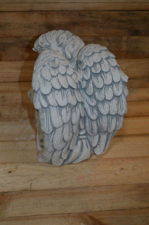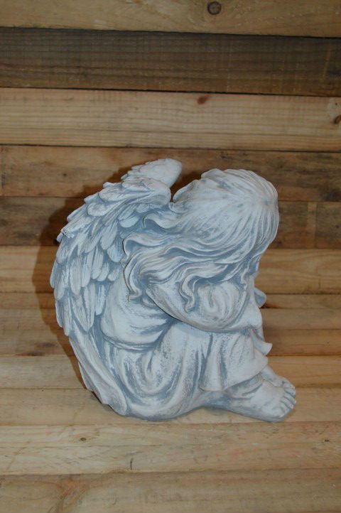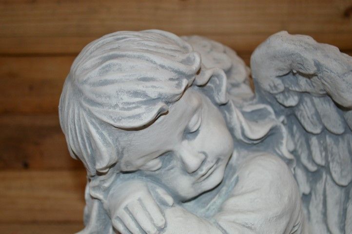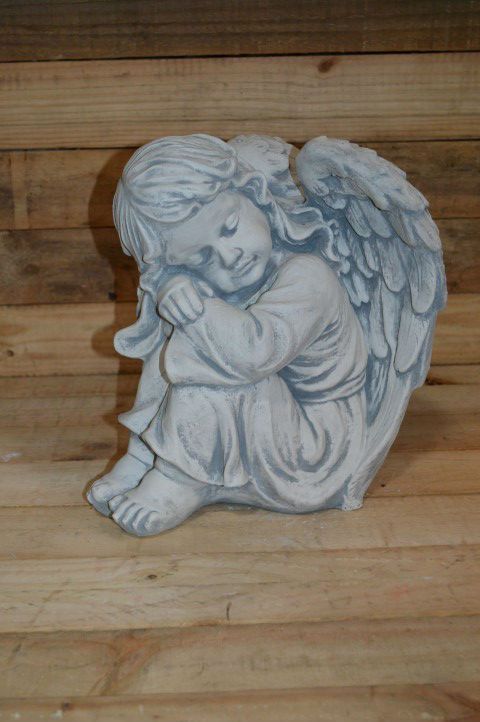 Het beeld is gemaakt van stevig beton, waardoor het zowel binnen als buiten gebruikt kan worden. De kleine engel zit rustig voorover geleund te slapen, wat een kalme en tijdloze uitstraling geeft. Vaak gebruikt als ornament bij een gedenkplek, maar ook een sfeervolle decoratie in elke kamer of tuin.