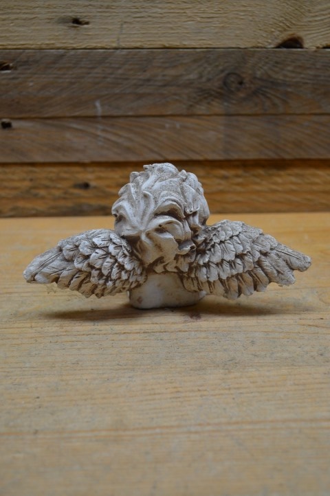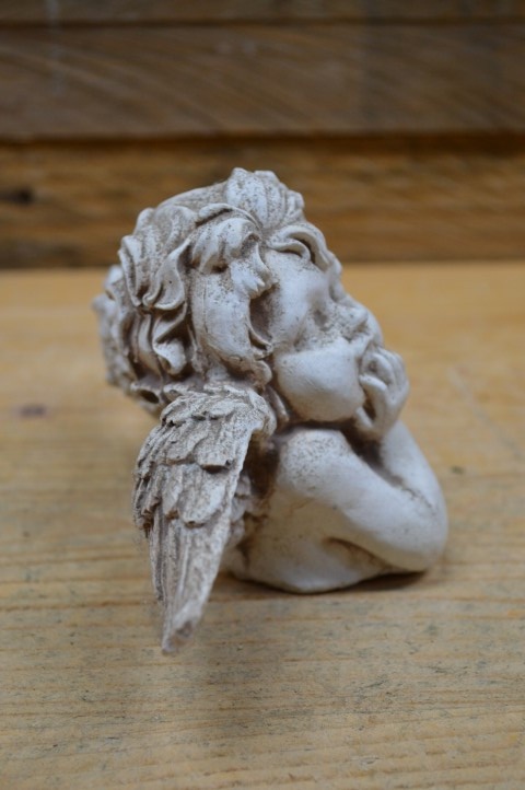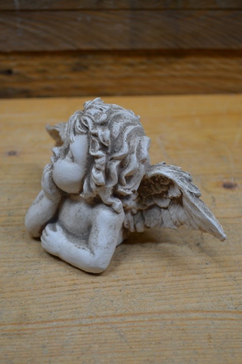 Dit betonnen beeld denkend engeltje klein is een sfeervol ornament van beton, met gespreide vleugels en een rustige, nadenkende uitstraling. Door het compacte formaat staat dit engeltje prachtig in een boekenkast of vitrinekast, maar dankzij het weerbestendige beton is het ook heel geschikt voor in de tuin of als grafdecoratie. Een liefdevol en veelzijdig beeldje dat overal een vredige sfeer brengt.