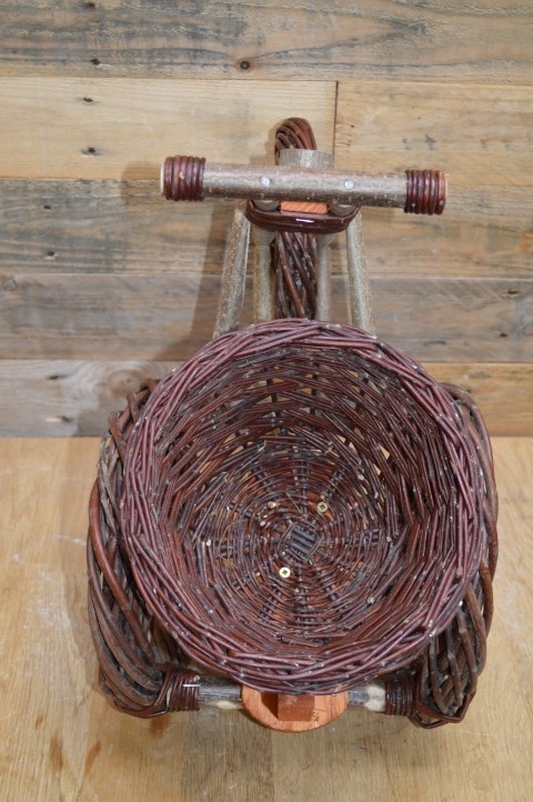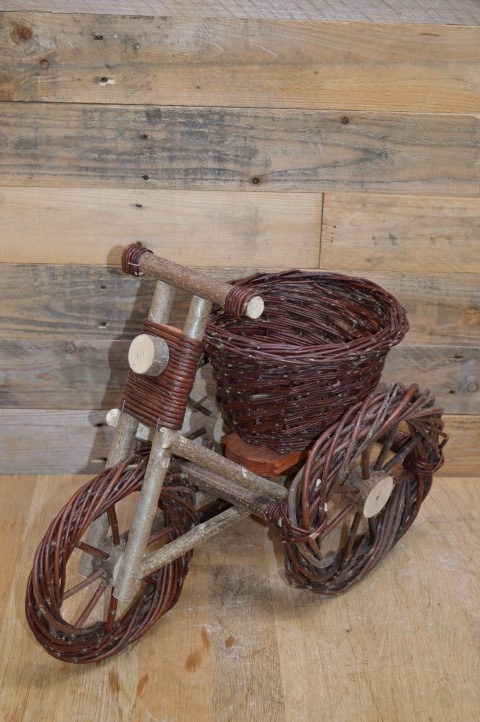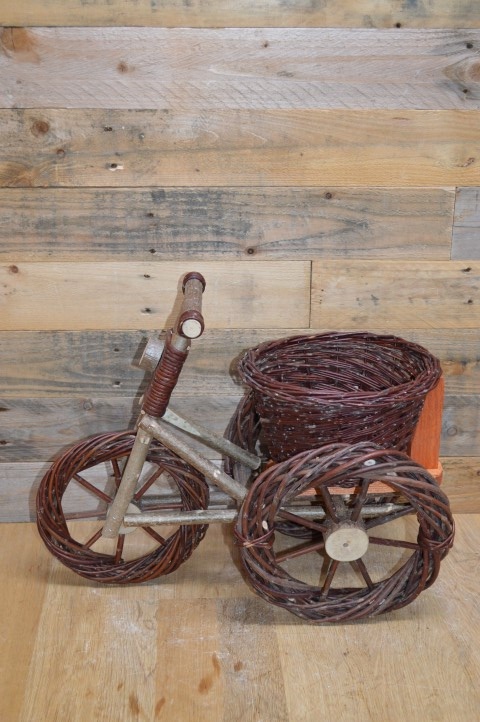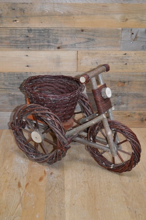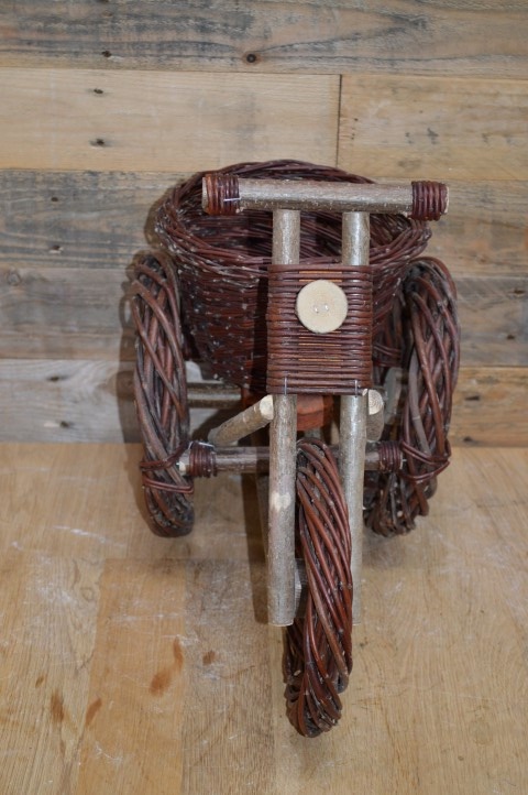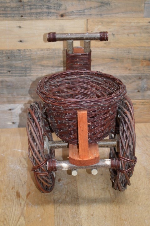 Driewieler fiets van wilgentenen met een bakje. Mooi stevig gevlochten plantenbakje uit wilgentenen met een frame van takken. Het is een geweldig decoratief met de hand gevlochten bloembakje voor binnen of buiten. Dit fietsje is de kleinere broer van het grotere driewielertje elders op de site.