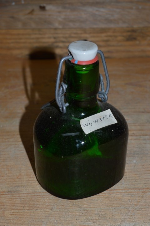 Dit karakteristieke oude beugelflesje met porseleinen dop en ludiek wijwater label is de ideale decoratie om een dressoir of vensterbank mee op te fleuren. Het flesje is al gevuld, maar daarnaast kan het natuurlijk ook leuk zijn om bijvoorbeeld een andere kleur of textuur aan de inhoud van het flesje toe te voegen.