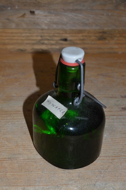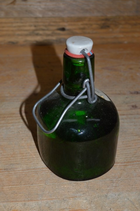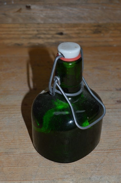 Omdat deze kleine beugelfles al eerder gebruikt is zijn er gebruikssporen aanwezig, maar deze zullen niet afdoen aan de schoonheid van dit groene lage flesje.