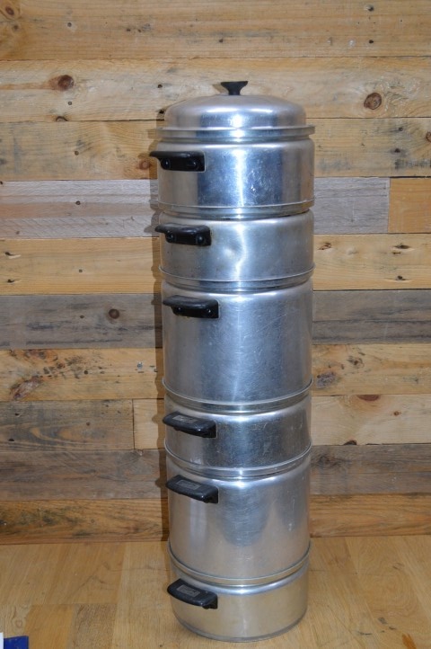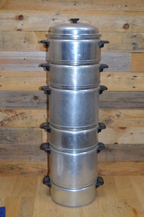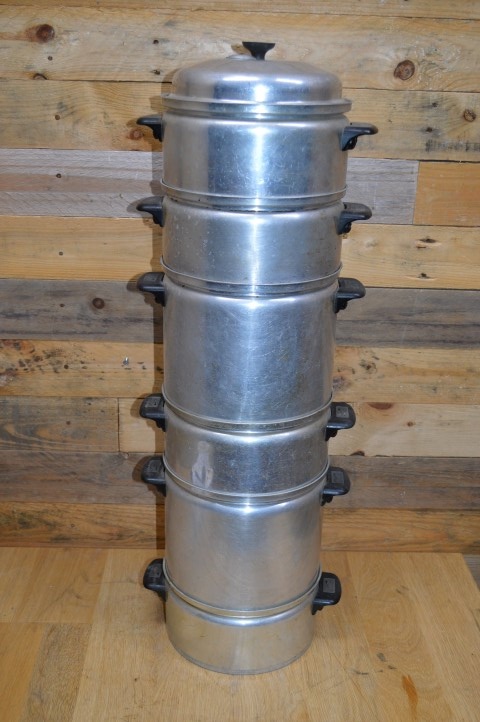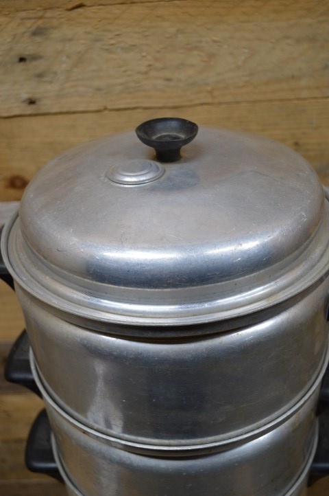 Vintage Fluks pannenset is gemaakt om gebruikt te worden als stoompannen. Het waterreservoir blaast de stoom naar boven waardoor het eten gaar stoomt. Deze pan wordt ook wel bapao stoompan genoemd maar hij natuurlijk voor veel meer dingen geschikt. Denkt u bijvoorbeeld aan het stomen van vis of groenten en het garen van spareribs. De stoompan is gemaakt van aluminium en is alleen geschikt voor elektrische kookplaten en gas pitten.