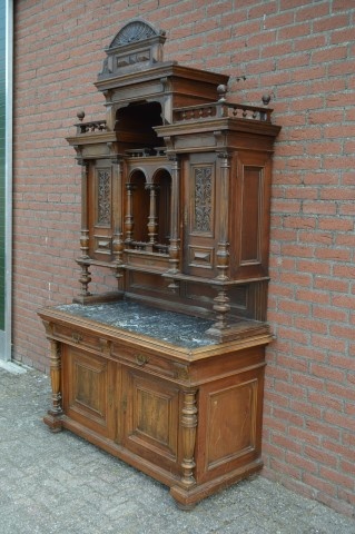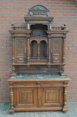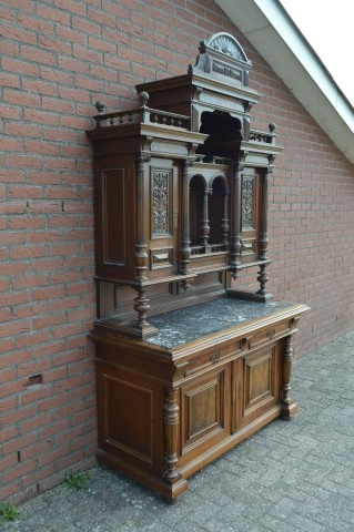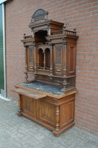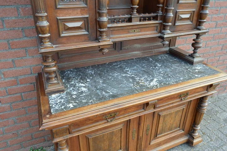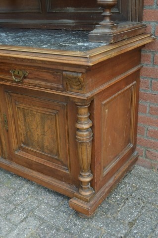 De antieke buffetkast met marmeren blad ademt karakter en vakmanschap uit de late 19e eeuw. Het dressoirgedeelte is voorzien van een stevig natuurstenen blad met een elegant grijs-wit marmerpatroon. Daaronder bevinden zich twee deuren en twee ruime laden, aangevuld met een praktisch uittrekblad dat vroeger werd gebruikt voor brood snijden of het neerzetten van glazen.