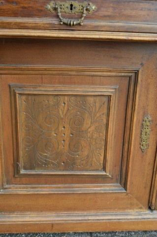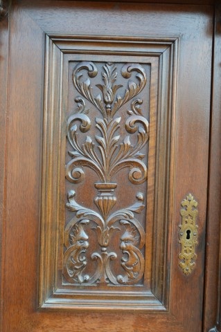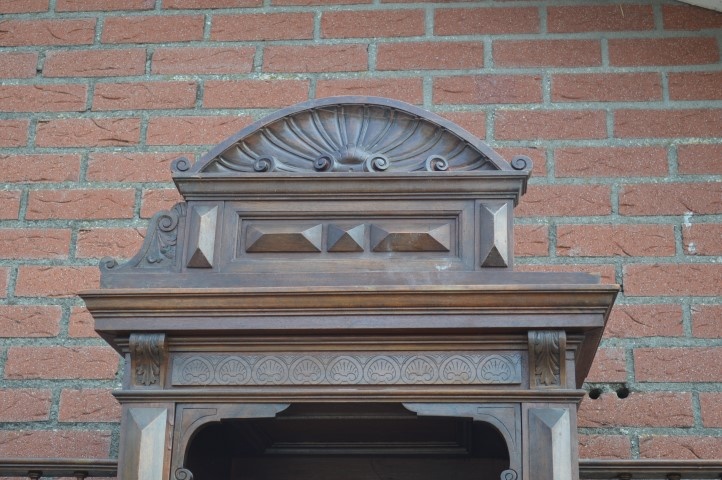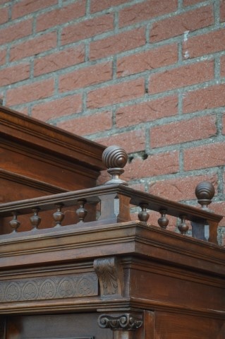 De bovenkast biedt twee deurtjes met schappen voor servies of glaswerk en een open nis waarin vroeger vaak een heiligenbeeld stond. De hoge kuif die de kast bekroont, geeft het geheel een statige, bijna koninklijke uitstraling. Met zijn oorsprong rond 1880–1890 heeft dit meubel generaties gediend als buffetkast en draagt het gebruikssporen die bijdragen aan zijn doorleefde charme. Een klein deel van de kuif is verdwenen en er zijn problemen met de sloten. De kast is driedelig, wat verplaatsen aanzienlijk eenvoudiger maakt.