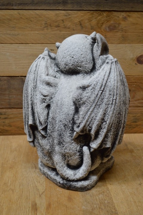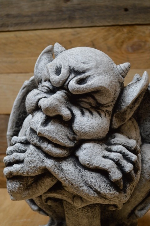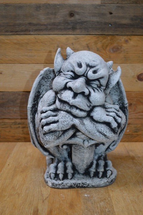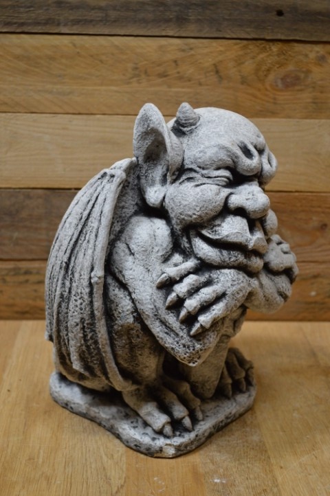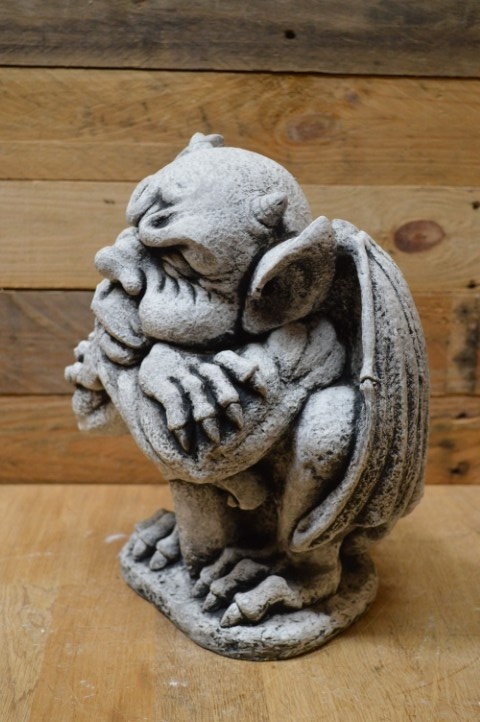 Waterspuwer met zwaard is een prachtig vormgegeven gotisch tuinbeeld van een slapende gargouille, ook wel dakduivel of steenwachter genoemd. Leunend op zijn zwaard lijkt hij te dommelen terwijl hij toch waakzaam blijft. Deze sierlijke betonnen waterspuwer is geïnspireerd op middeleeuwse kerken en kastelen, waar dergelijke beelden bedoeld waren om het kwade te weren. Gemaakt van duurzaam gietsteen en geschikt voor binnen en buiten – een uniek object dat karakter en mystiek toevoegt aan je tuin of terras.