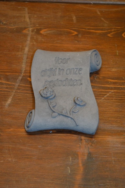 Het herdenkingsbordje boekrol is een stemmige betonnen plaquette met een troostende boodschap: “Voor altijd in onze gedachten”. De vorm van een klassieke boekrol geeft dit bordje een bijzondere uitstraling. Perfect voor bij een graf, gedenkplek in de tuin of een stille hoek in huis. Door de duurzame materiaalkeuze is het geschikt voor buiten én binnen, en blijft het jarenlang een mooie herinnering.
