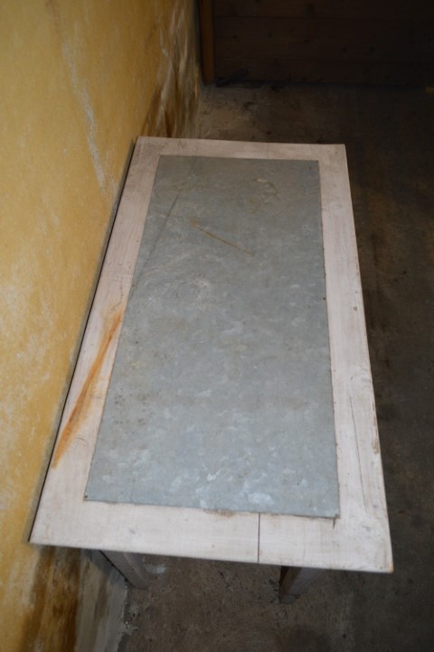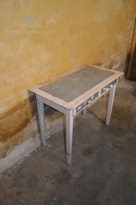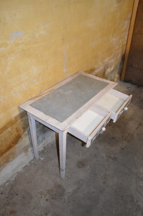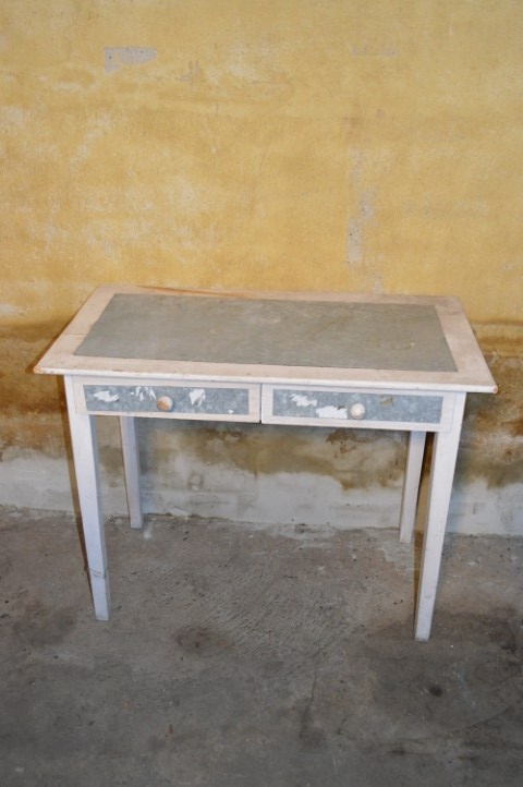 Het tafeltje is voorzien van twee laden aan de voorzijde en een blad dat is belegd met een metalen plaat. De verf is mooi afgebladderd en verweerd, wat zorgt voor veel karakter en een authentieke uitstraling.