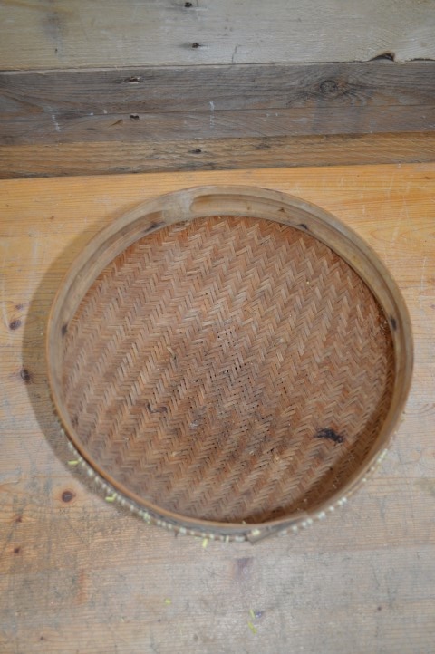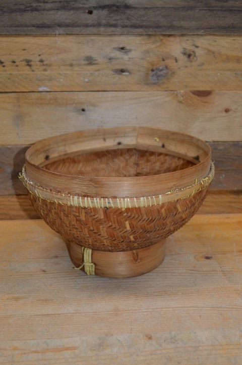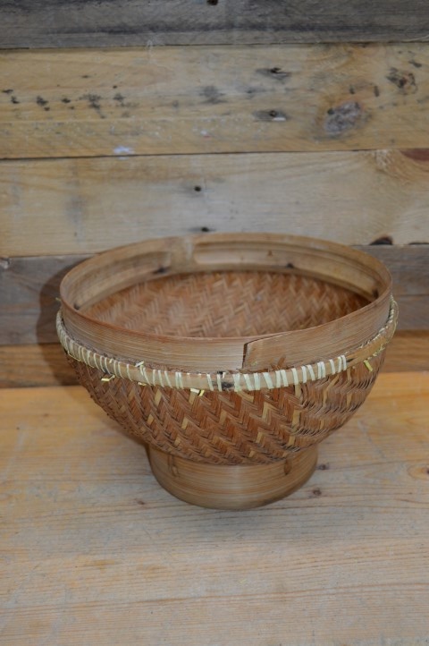 Vintage bamboe rijstmandje. Dit mandje is met de hand gevlochten in Indonesië. Dit soort bamboe rijst mandjes worden gebruikt om tijdens een rijst tafel de warme rijst te presenteren op een originele wijze. Binnen in het rijstmandje wordt eerst een bananenblad geplaatst en hierop wordt de warme rijst geplaatst. Dit mandje kan beter dienst doen als mooie fruitschaal of als decoratie.