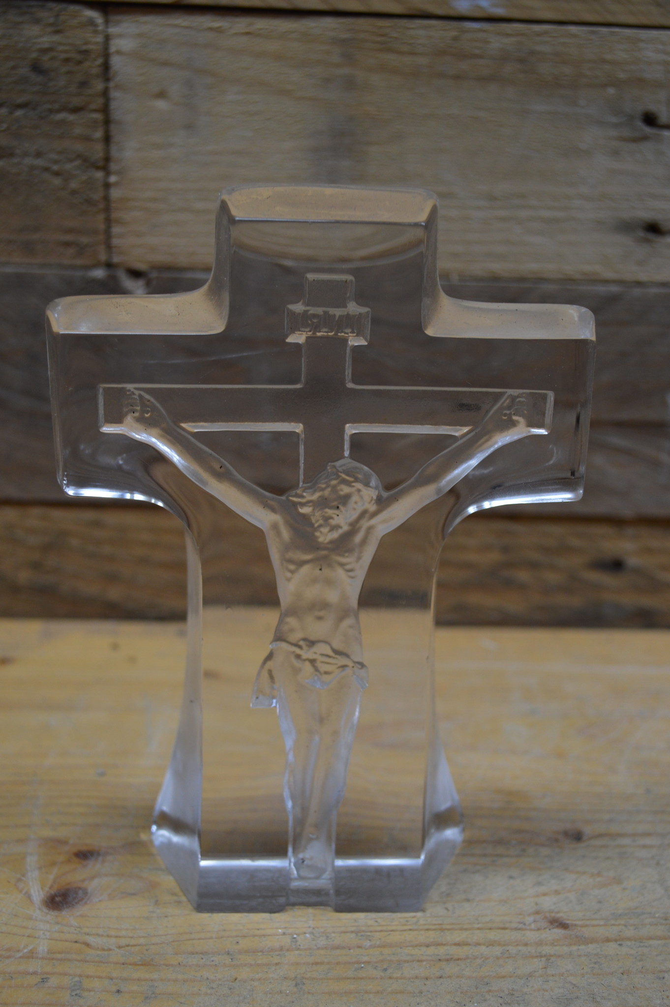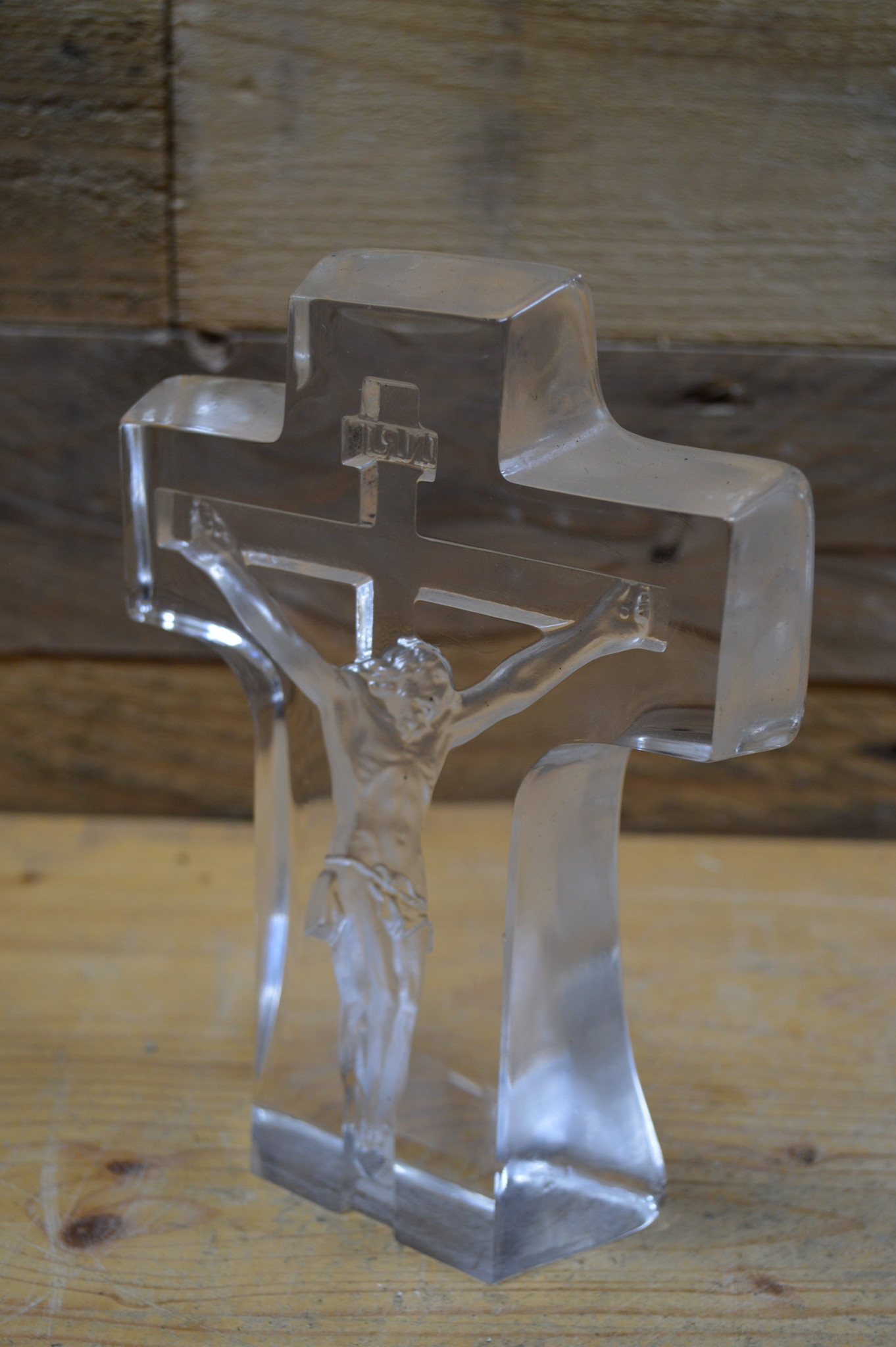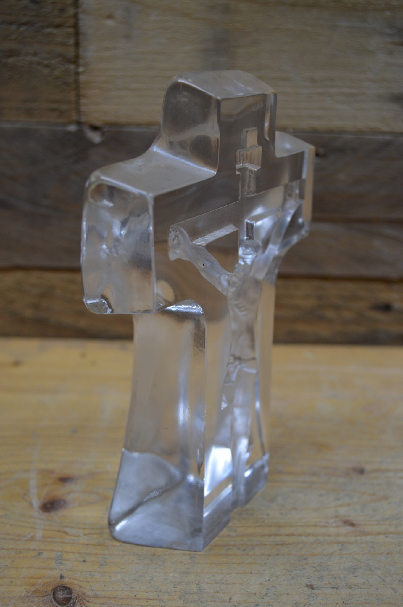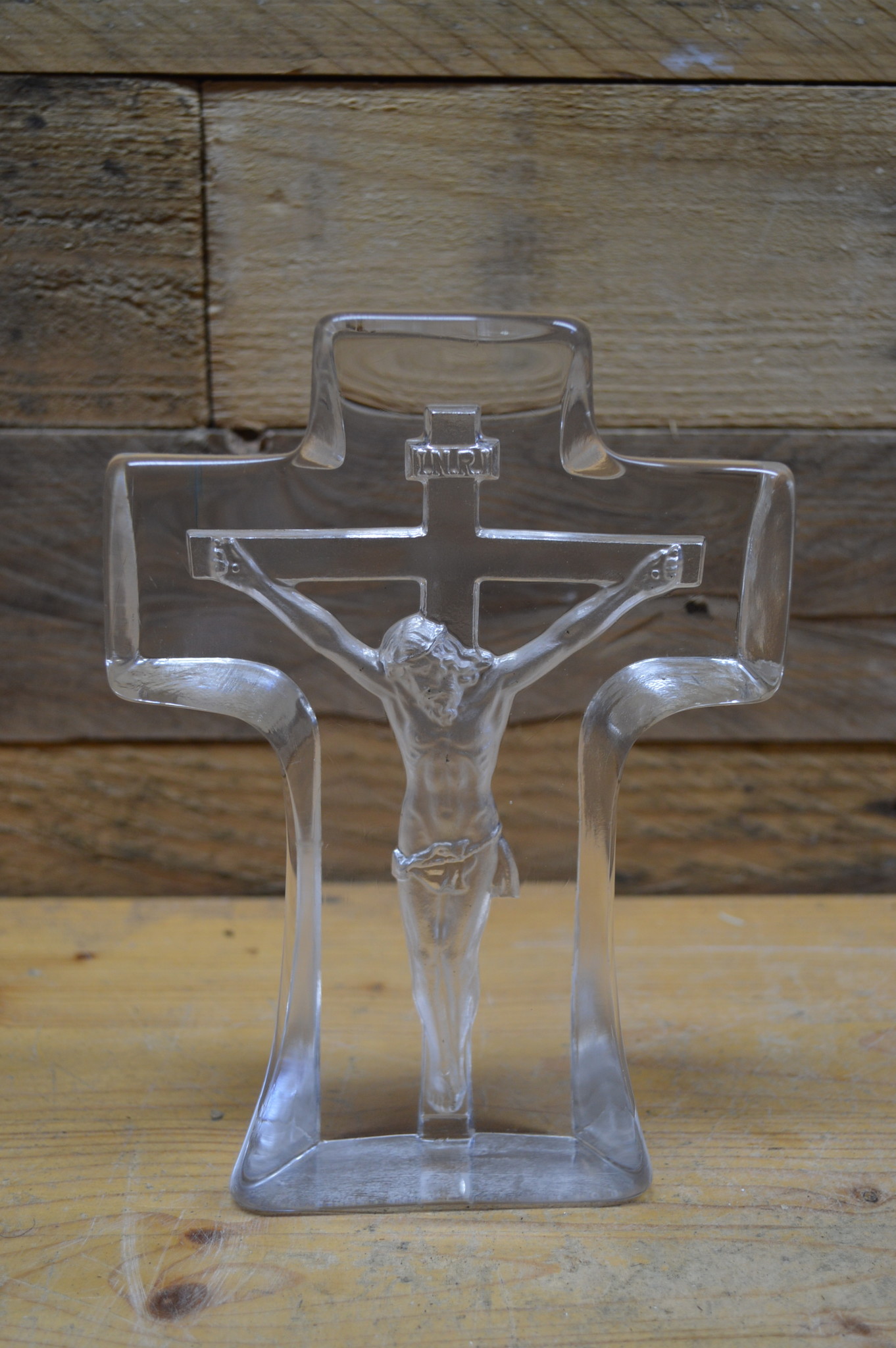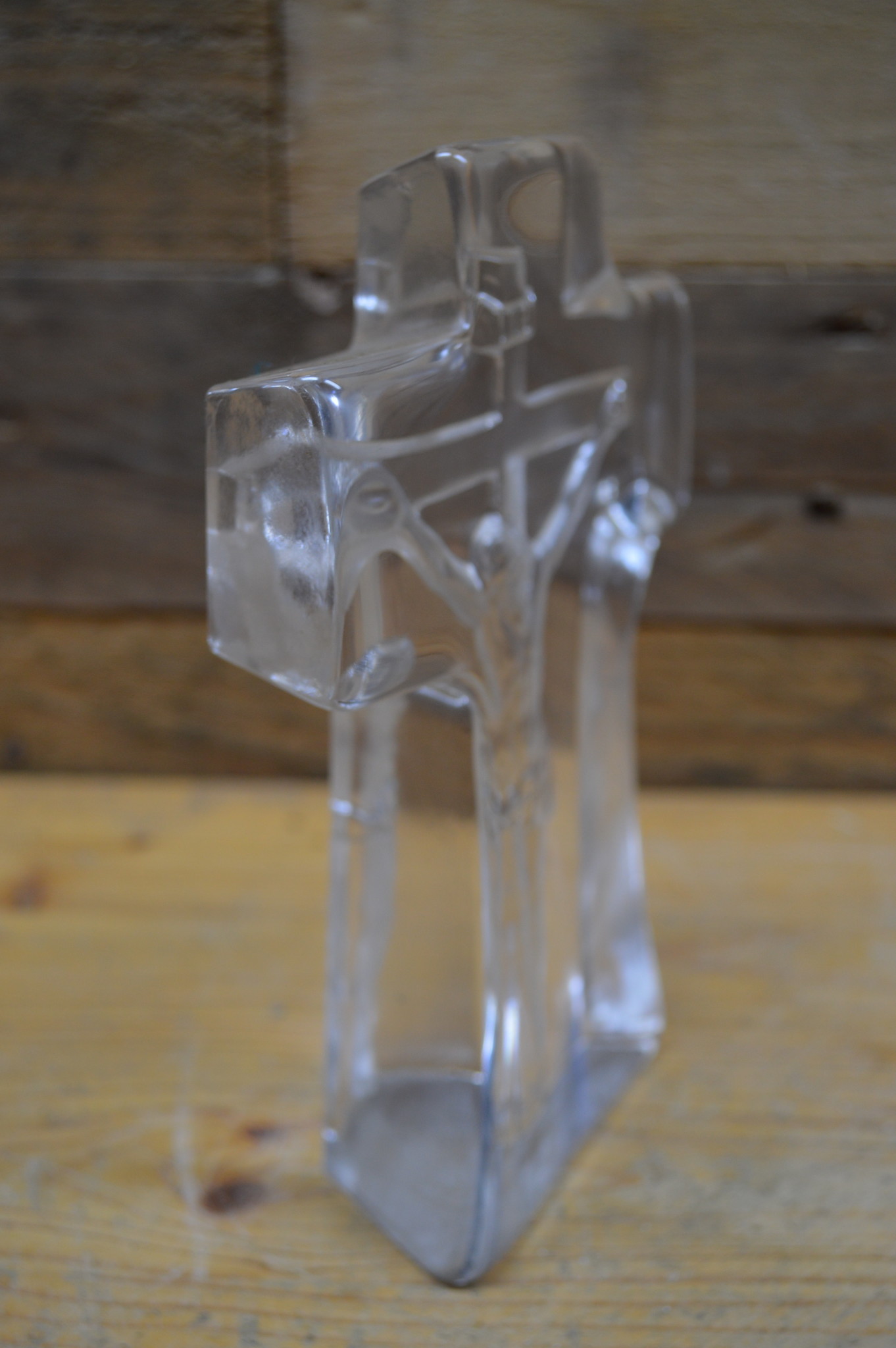 Dit glazen kruisbeeld met Jezus is een elegant staand decoratiebeeldje dat prachtig staat op een dressoir, in de woonkamer of op de slaapkamer. Ideaal als stijlvol herdenkingsbeeld of als religieuze woondecoratie. In tegenstelling tot houten kruisbeelden is dit glazen exemplaar niet bedoeld voor wandmontage, maar juist om neer te zetten. Het beeld is tweedehands en heeft daardoor een uniek karakter, maar verkeert nog steeds in goede staat. Een echte blikvanger met symbolische waarde.