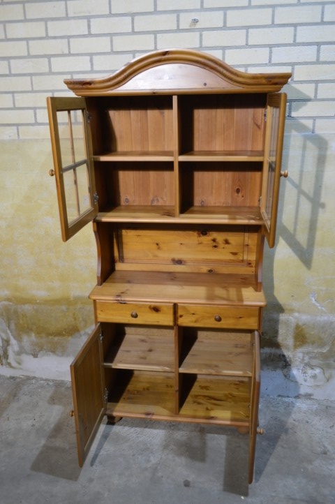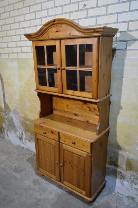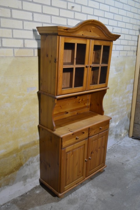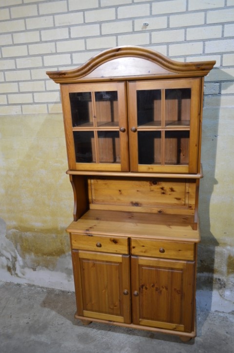 Deze grenen vitrinekast combineert opbergruimte met een mooi displaygedeelte. Bovenin bevinden zich glazen deuren, ideaal voor het tonen van servies of decoratie.