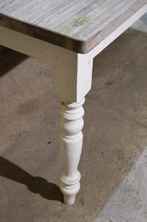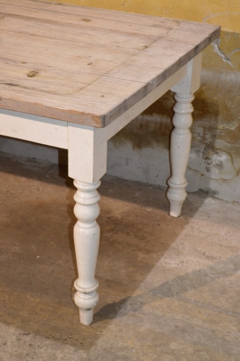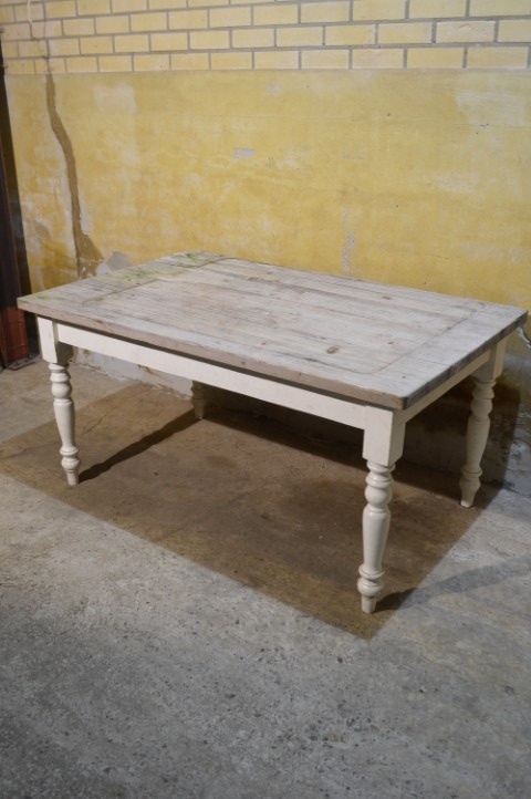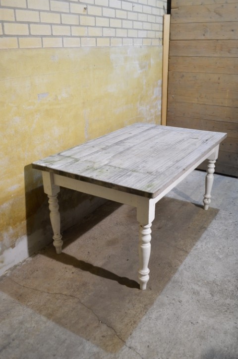 Deze landelijke grenen eettafel is een praktische tafel voor dagelijks gebruik. De tafel heeft gedraaide, wit geschilderde poten en een verweerd blad waarbij de houtnerf zichtbaar en voelbaar is.